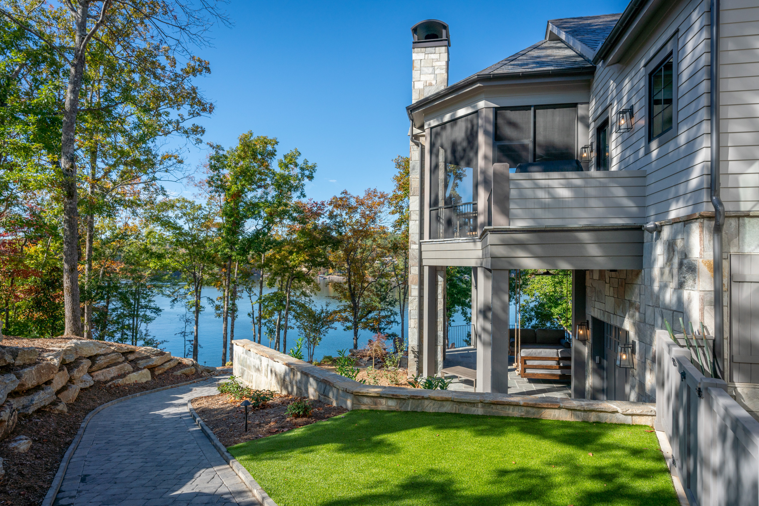 The screened-in porch creates a cover for a patio beneath it. The path seen here leads to a fire pit area that’s closer to the lake. To the right of the porch is the small grilling deck.
