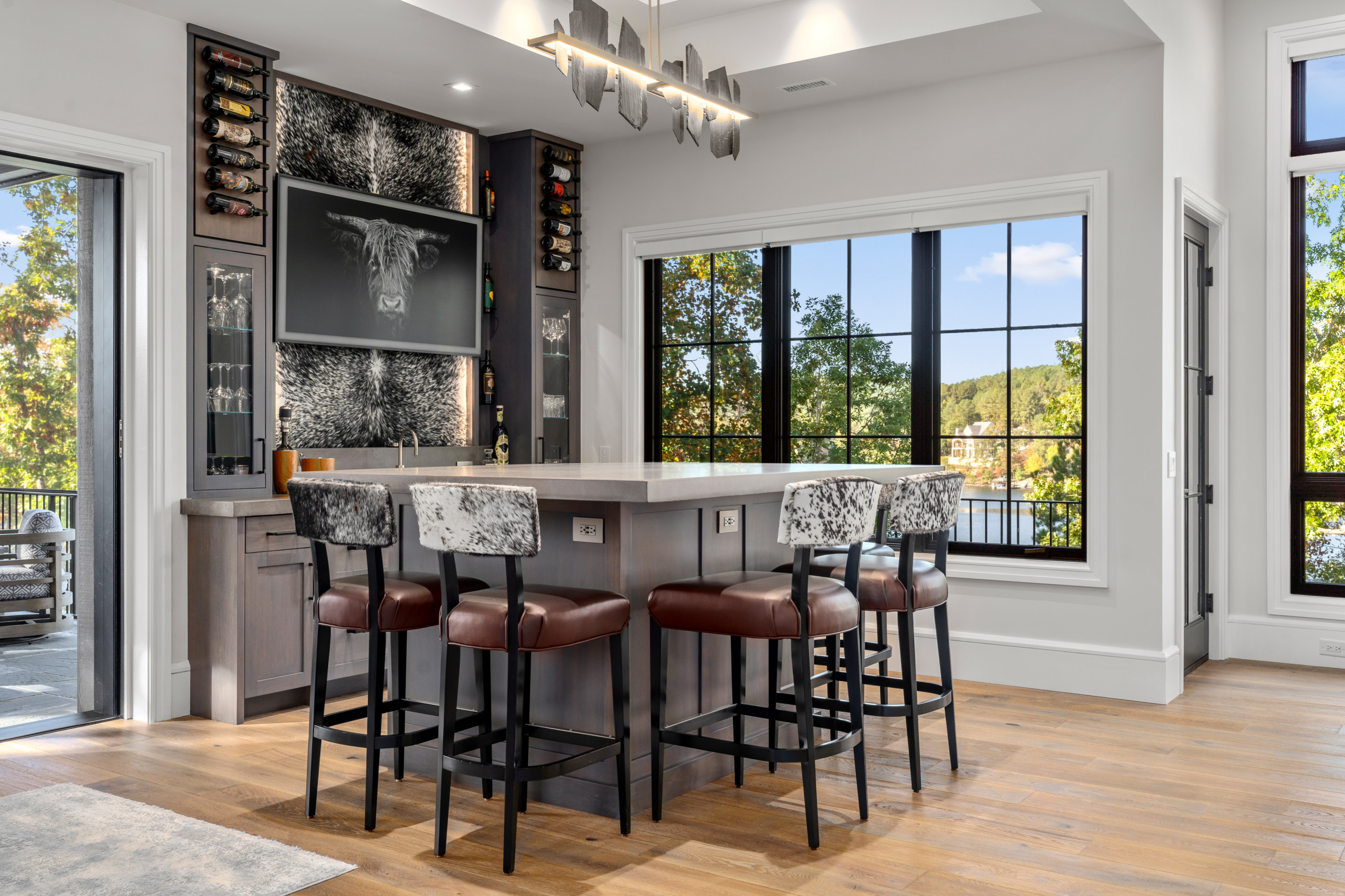 The bar’s style is also cohesive with the porch’s style. The concrete countertop is the same color as the porch’s mantel. Also, the large pieces of slate in the chandelier nod to the stone on the porch.