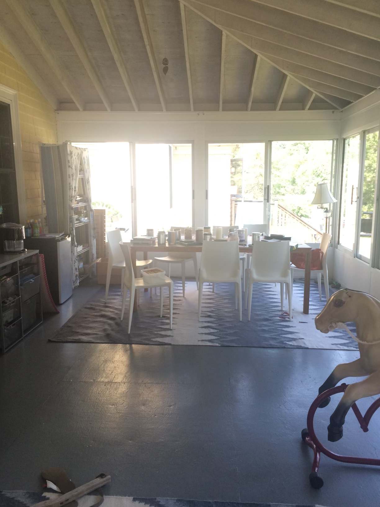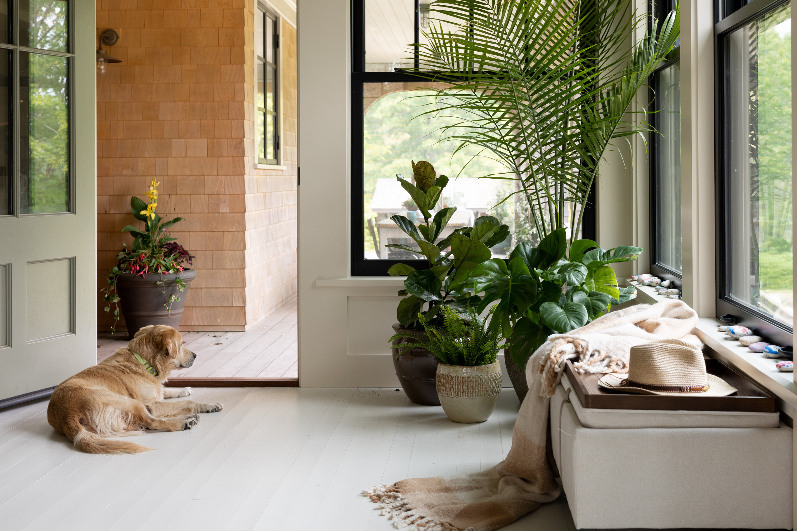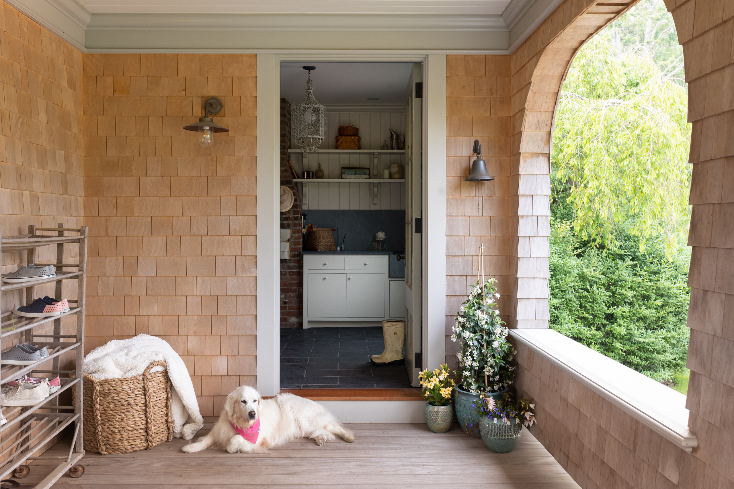 Willoughby, one of the homeowners’ dogs, enjoys the porch view here.