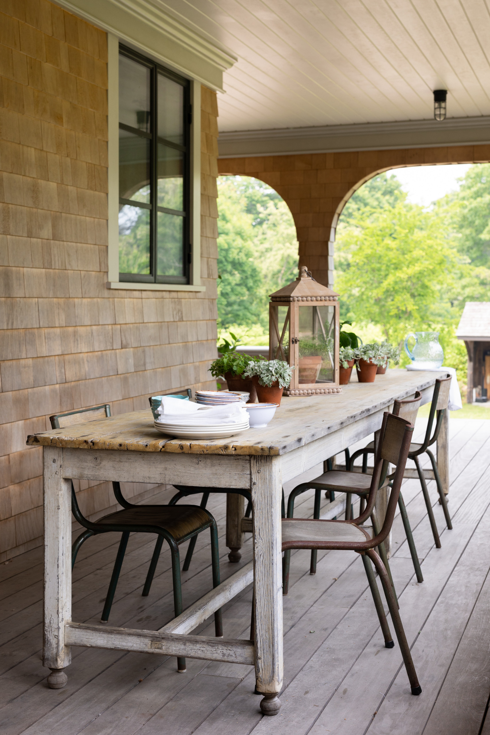 Stepping out from the sunroom onto the new open porch, guests come to this rustic farm table used for gatherings. “The table takes up a good amount of space, so it invites you to sit down for a while and enjoy being out there,” Amato says. Another set of stairs leads down to the backyard.