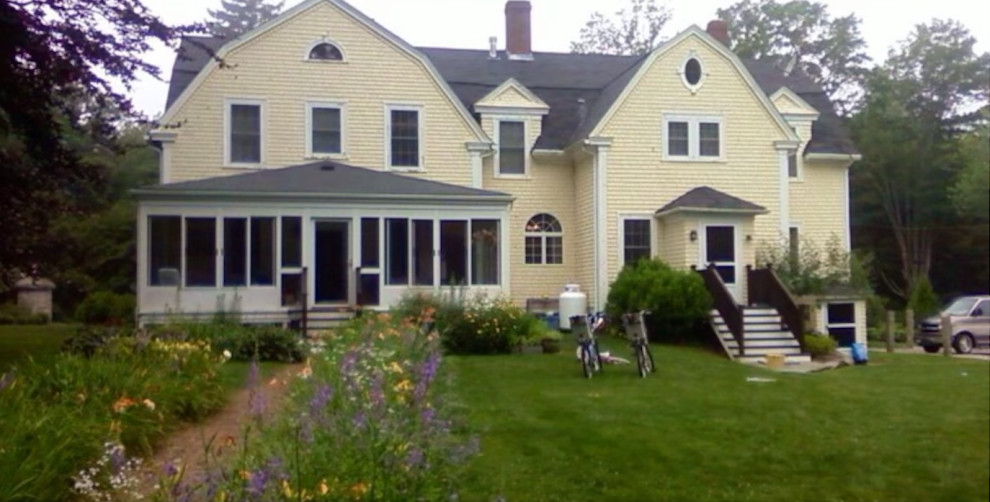 Before: The renovation also involved replacing the home’s exterior cedar shingles, which originally covered only the front facade. “We knew we wanted to continue the cedar around the back. We wanted to maintain a historical feel that felt authentic to New England,” Amato says. The original shingles were red cedar, but Amato and the homeowners opted for something that would age to a lighter color.