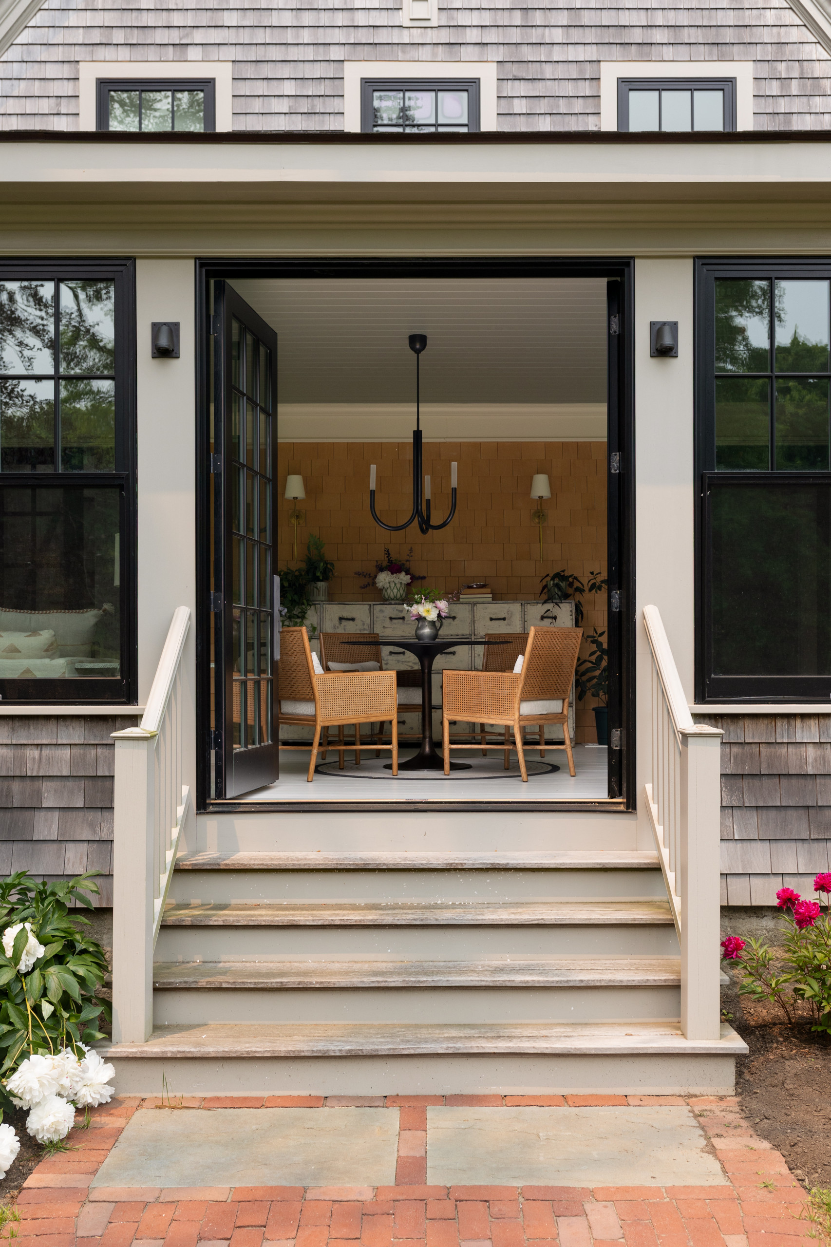 Another set of French doors leads from the sunroom to a series of steps down to the backyard.