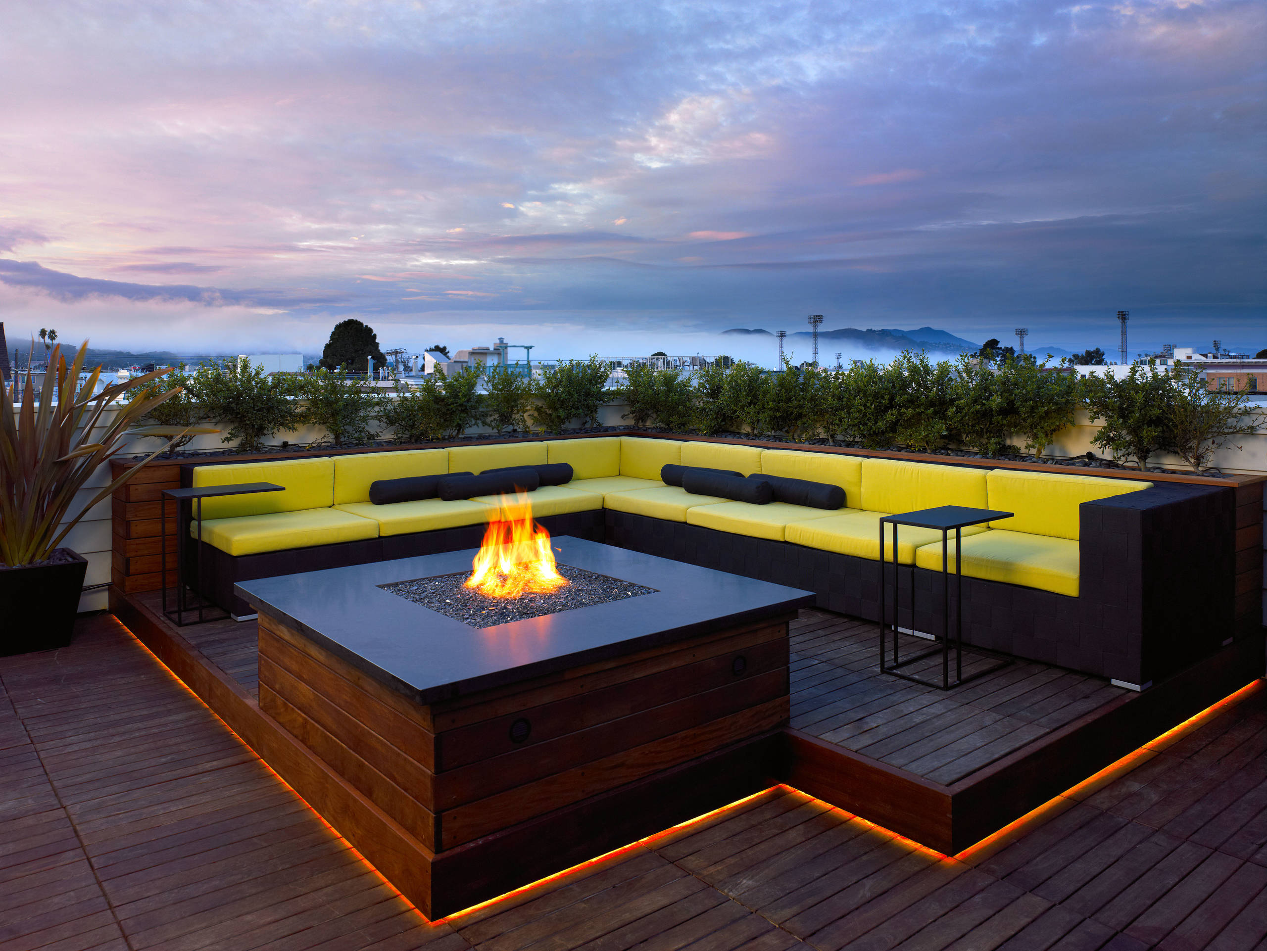 As fog rolls into San Francisco Bay, this rooftop terrace works as a perfect vantage point from which to take in the view. To make the space inviting during the chilly months, a custom-made fire pit was installed. Its concrete surround was designed to stop any embers landing on the timber flooring. To demarcate the living zone, LED strip lighting was installed, and the orange tone draws inspiration from the fire above.