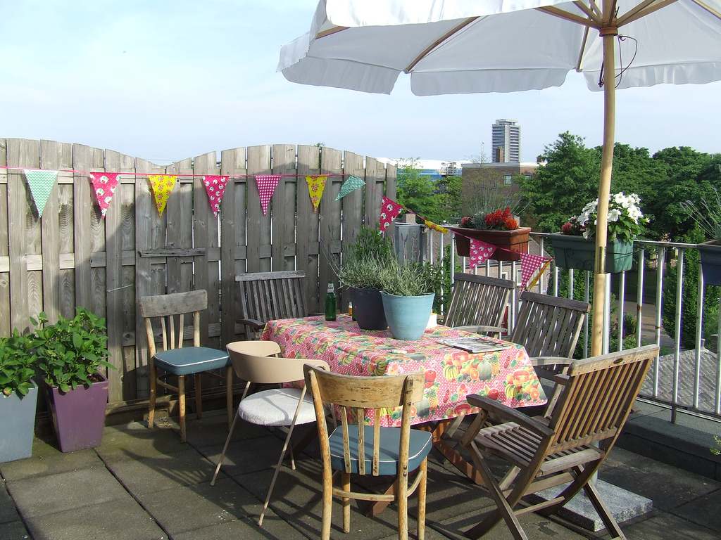 If you’re looking for an inexpensive revamp of a rooftop garden, look at vintage stores, op-shops, eBay, markets and even Ikea for some basics. That’s the approach taken by Nina van de Goor, a ceramics/paperwares designer, who made this zone unpretentious and slightly retro.