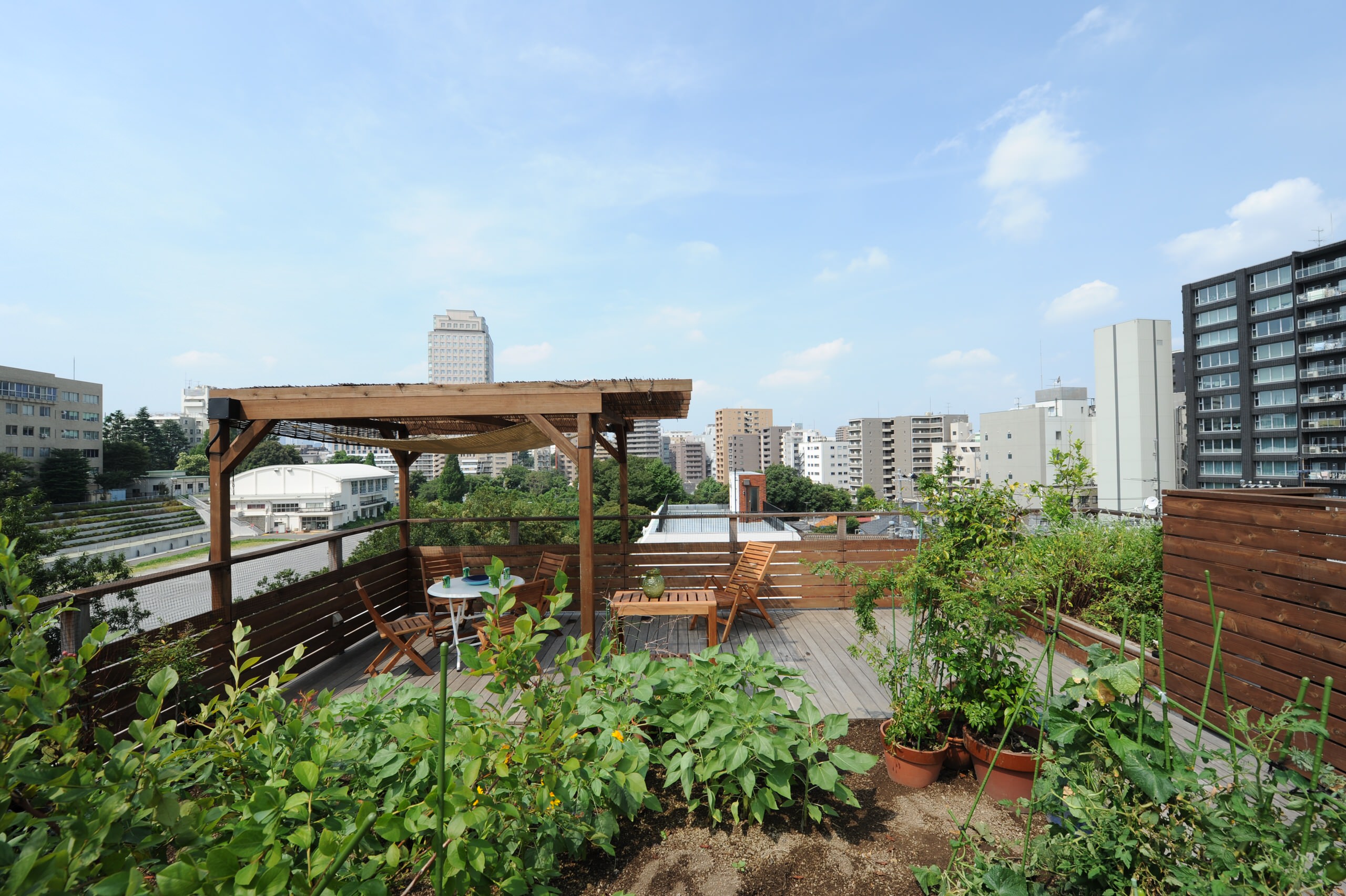 Doubling as a herb garden, this rooftop zone has a timber pergola that makes it inviting on even the hottest or rainiest days. Herb gardens such as this will grow well if the terrace receives an abundance of sunlight. All that is then required is to add good drainage and good soil. Grow such herbs as parsley, rosemary, peppermint and lemon balm, and maintain with regular watering and harvesting.