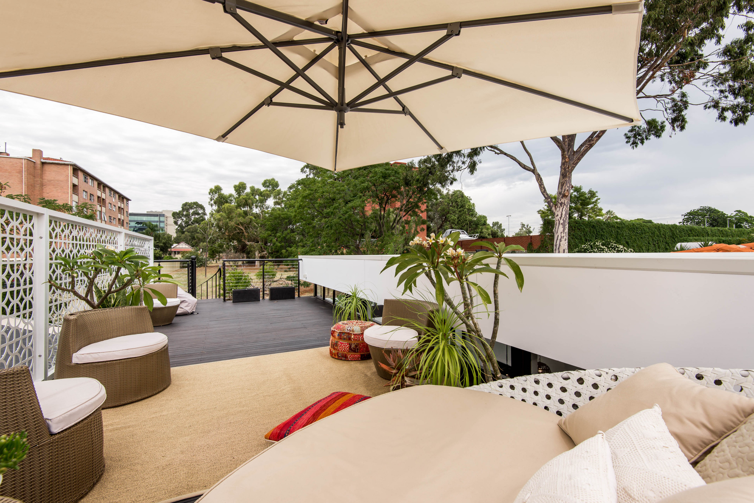 This rooftop garden has a cottage feel that’s casual and inviting. Potted shrubs and perennials add vibrancy and fragrance to the outdoor zone, while decorative elements – floor lanterns and cream cushions – add a touch of Hamptons-esque elegance. When designing a rooftop terrace, structural load and an effective waterproof membrane must be considered in the early stages. For advice, talk to an architect, landscaper or engineer.