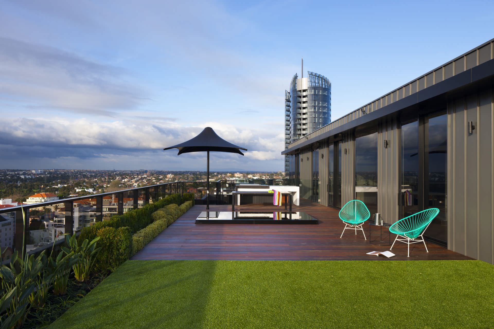 Such a rarity, this expansive green roof boasts an array of sedum and tall grasses that create a wild, low-lying environment. Unlike the traditional rooftop garden, most of the surface is planted partially or completely with vegetation. The apartment’s exterior utilises coloured glass panels that, along with the green roof garden, bring a sense of nature to the big smoke.