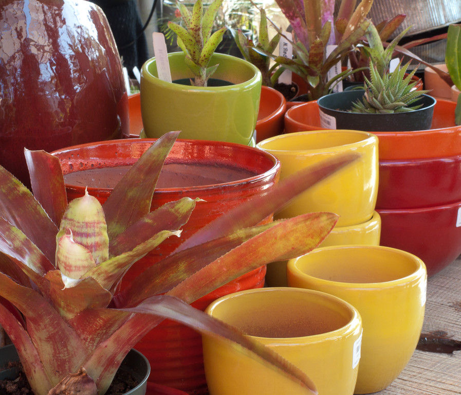 Colorful pots are arranged in complementary shades of orange, red and yellow.