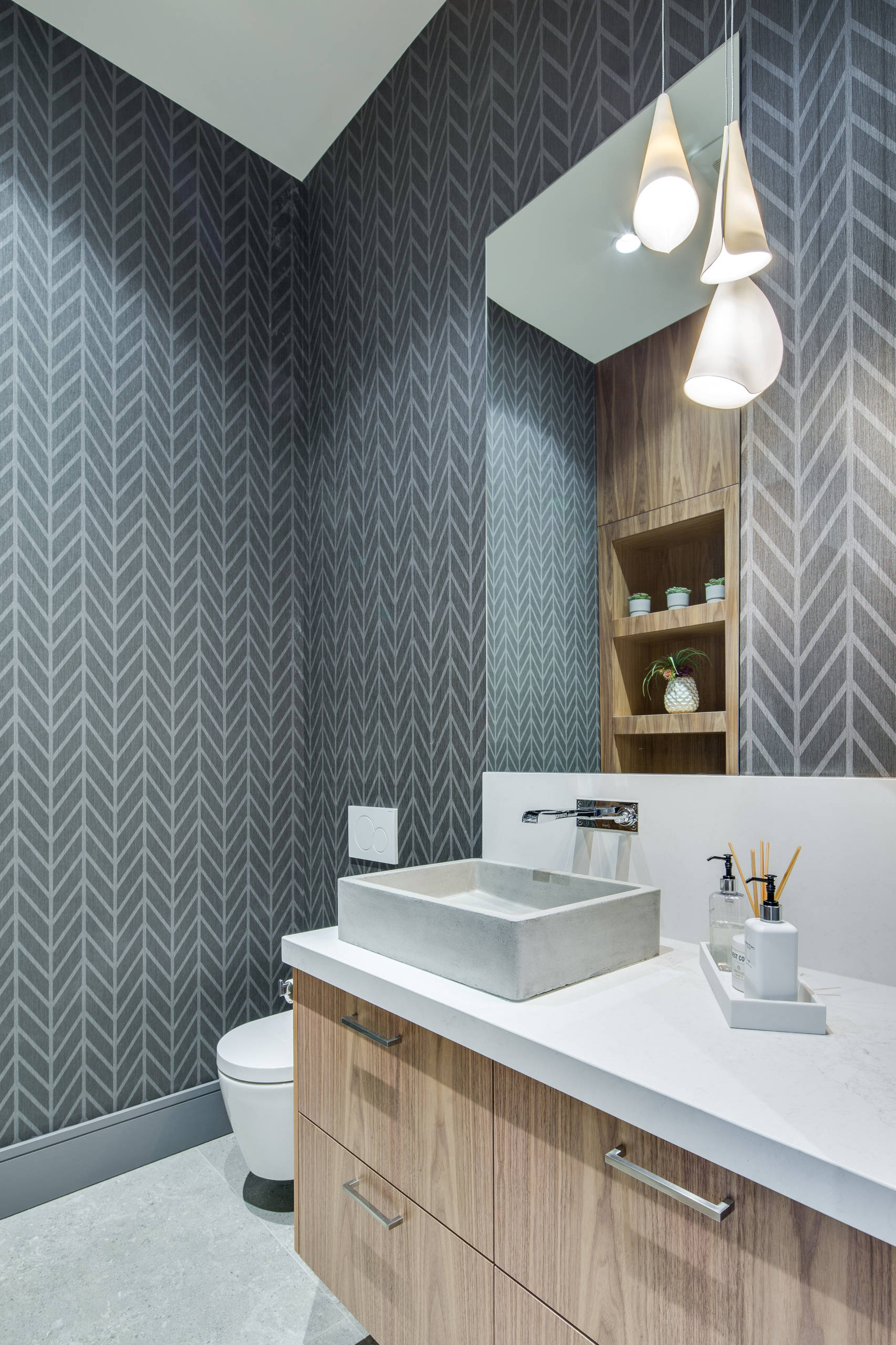 The charcoal-gray tiles laid in a chevron pattern add a cool, contemporary touch to this Vancouver powder room by Gilroi Construction. Other contemporary features include the floating vanity, square vessel sink and sculptural pendant light.