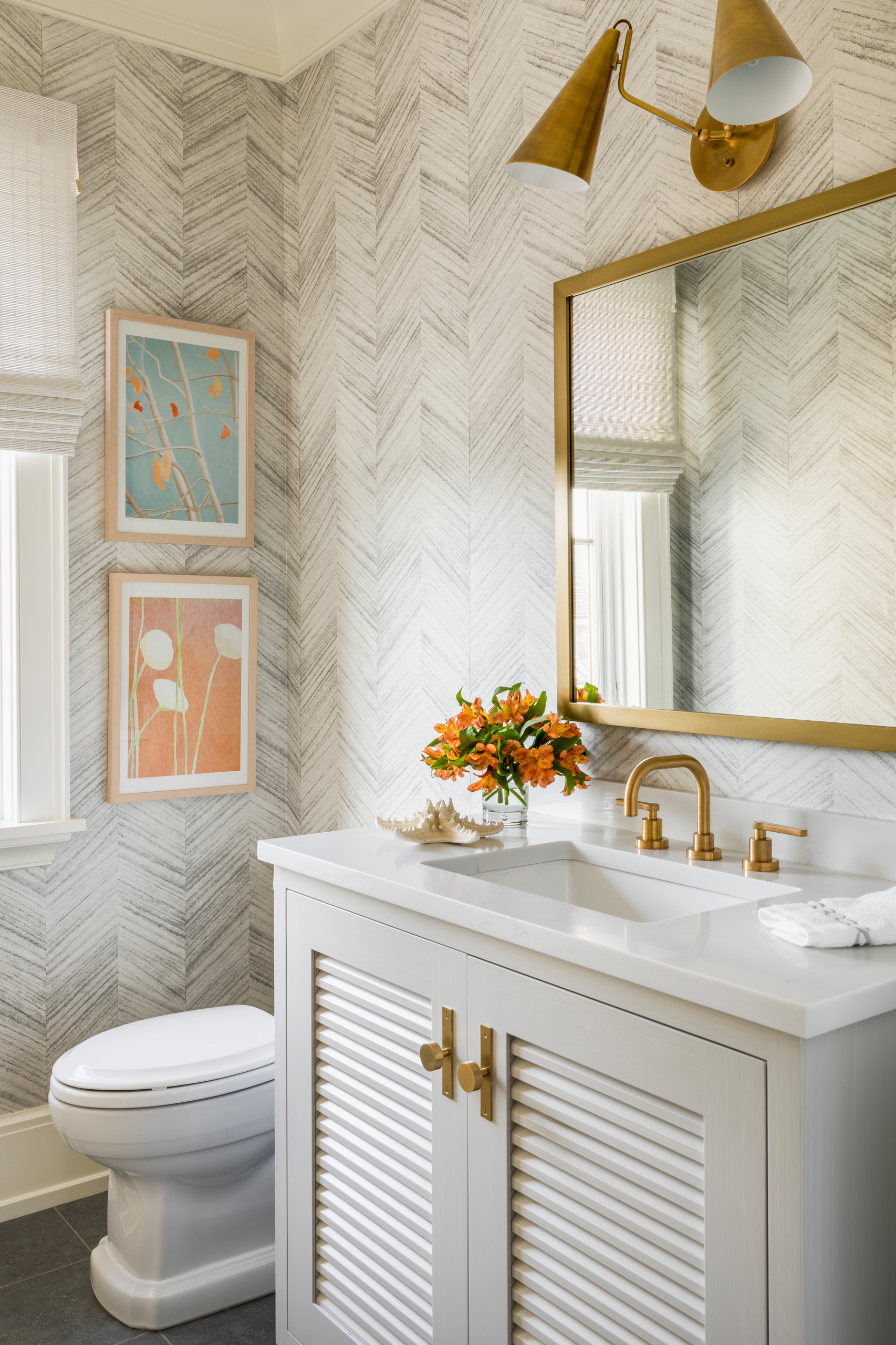 This beach house powder room in New York was designed by the team at ML Interior Designs. The space features a neutral-tone wallpaper that has a subtle chevon pattern, along with many brass touches, including the sink hardware, lighting and mirror.