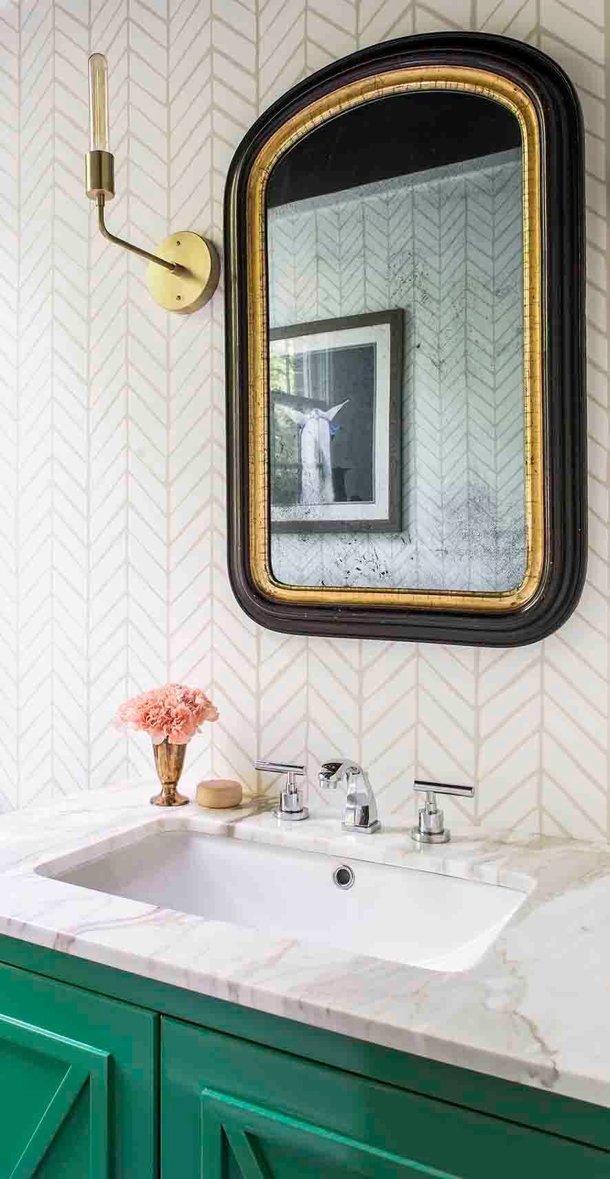 The white ceramic tiles laid in a chevron pattern provide the perfect backdrop in this Atlanta powder room. An antique mirror, a marble-top green vanity and a modern brass wall sconce help to create the transitional vibe the design team desired.