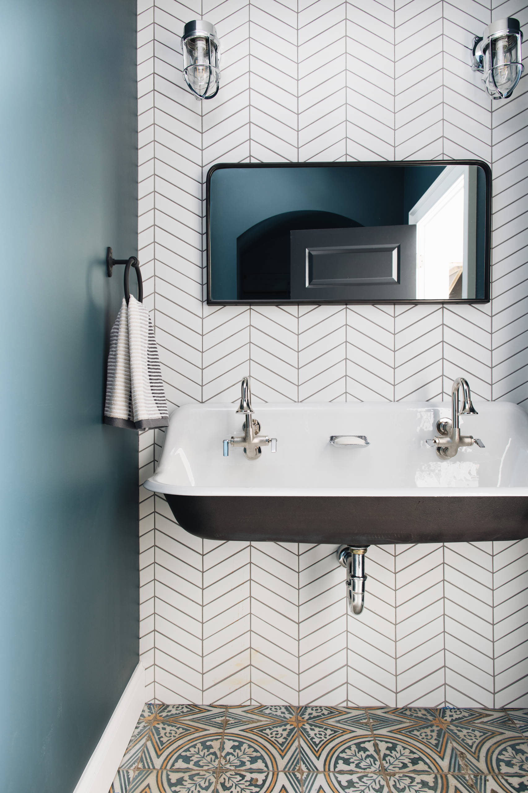 A cast iron sink with two faucets and a pair of caged wall sconces add an industrial vibe to this Grand Rapids, Michigan, powder room by Kenowa Builders. The bold concrete floor tiles and white tiles laid in a chevron pattern complete the look.
