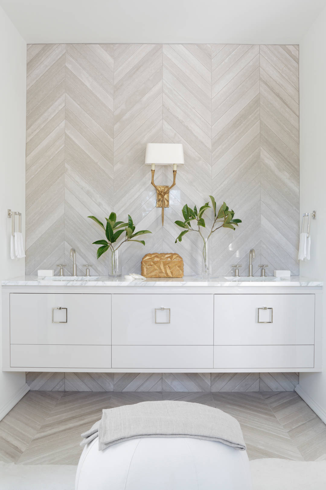 The same wood-look tiles laid in a chevron pattern on the floor run up the vanity wall in this Atlanta powder room, making a dramatic statement. Other highlights of this chic space include the floating sleek double vanity and stylish shaded wall sconce.