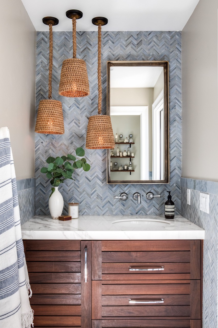 Three woven pendant lights hung at different heights demand attention in this eclectic Orange Country, California, powder room by Denise Morrison Interiors & House of Morrison. The thin blue-and-white wall tiles laid in a chevron pattern are another highlight.