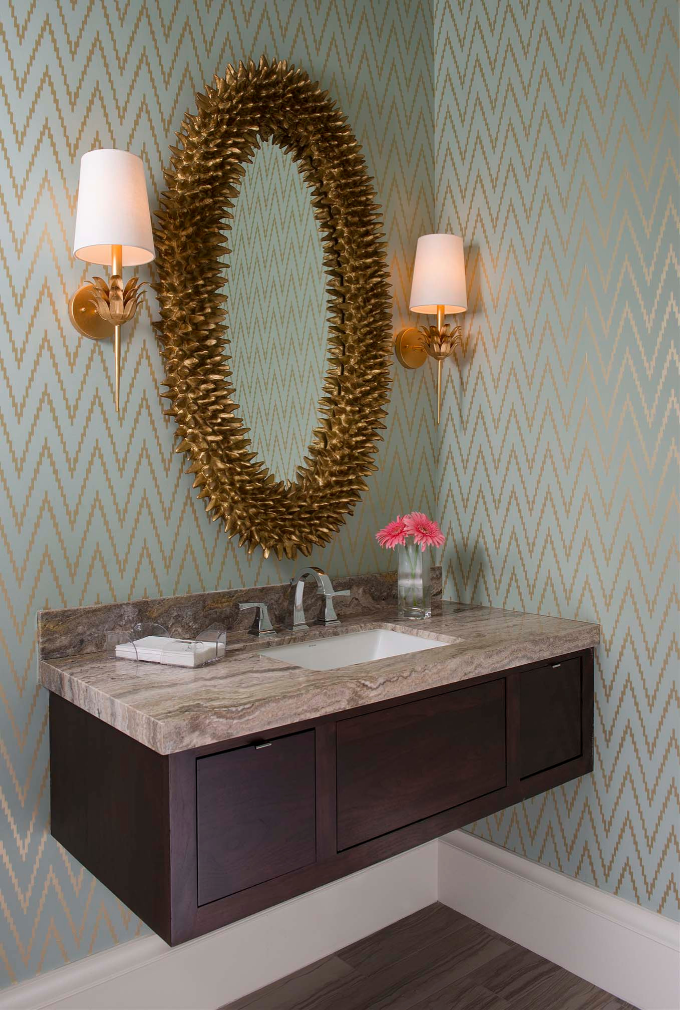 Gold zigzagging lines against a green background create a chevron pattern on the wallpaper in this glamorous Dallas powder room by Ellen Grasso & Sons. The gold wall sconces and spiky gold mirror are other stars.