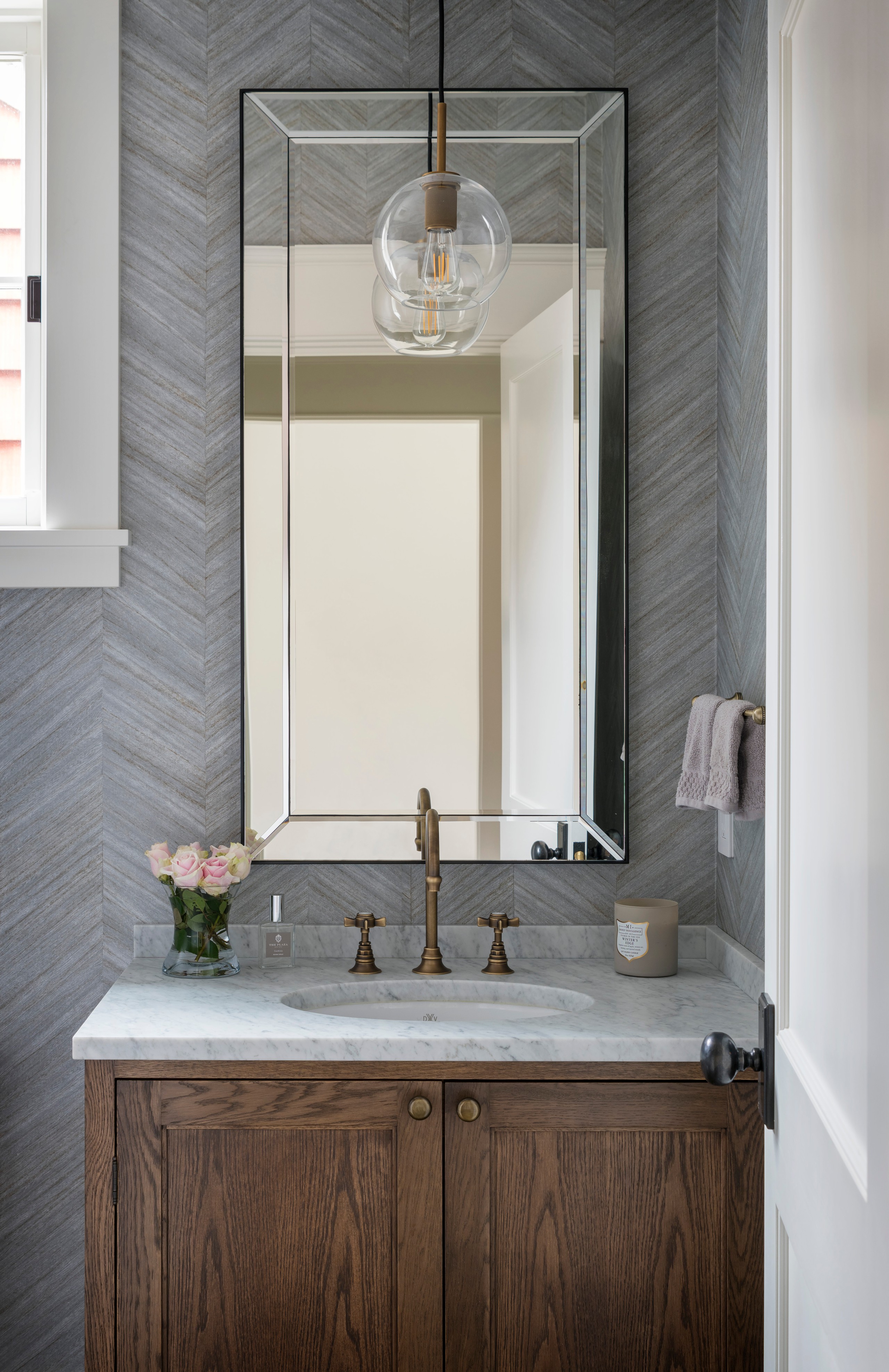 The chevron-pattern wallpaper in this Seattle powder room by Dyna Contracting mimics gray-washed wood, adding a rustic touch. A globe pendant hung from the ceiling and a wood vanity with a marble countertop complete the scene.