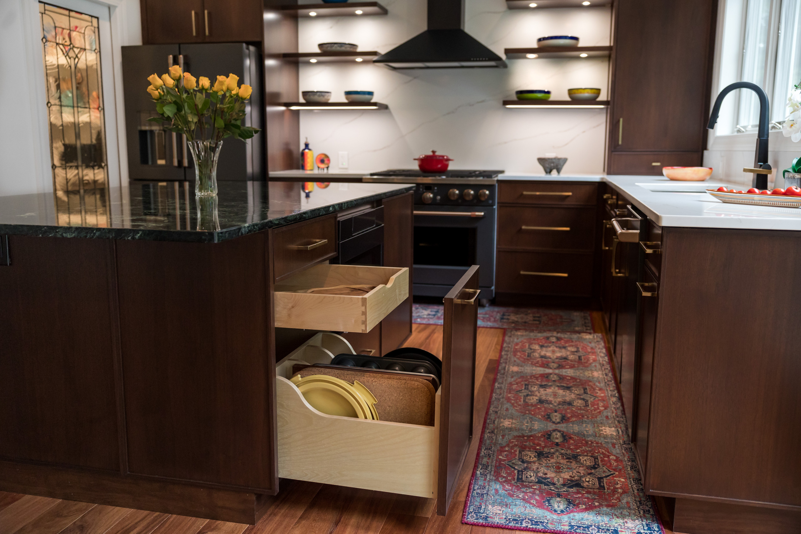 “Deep drawers allow you to store pots and pans, large bowls and other items in a way that is far more accessible than a wall or base cabinet,” says Arthur Zobel, owner of Zobel & Co. Kitchens in Glens Falls, New York.