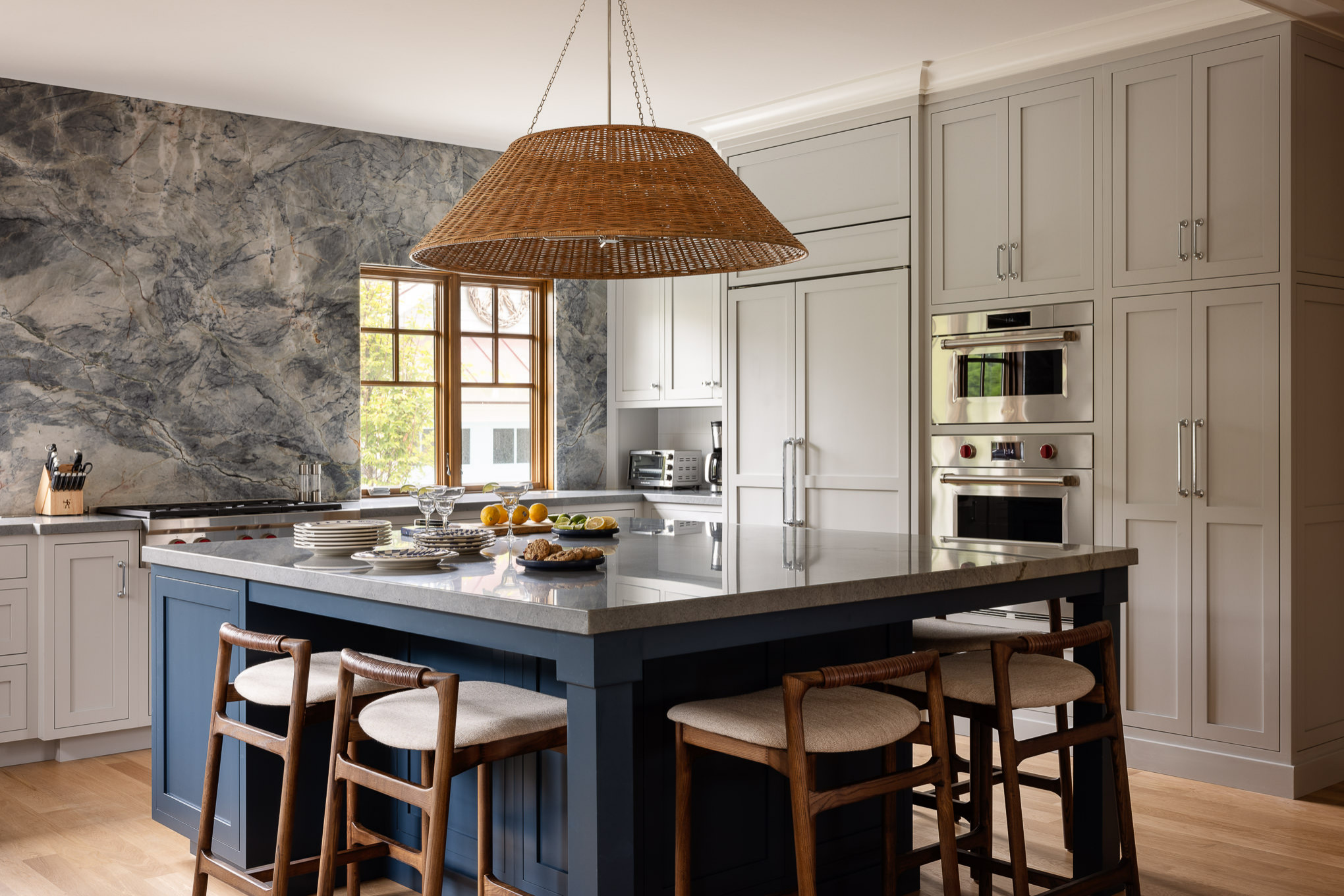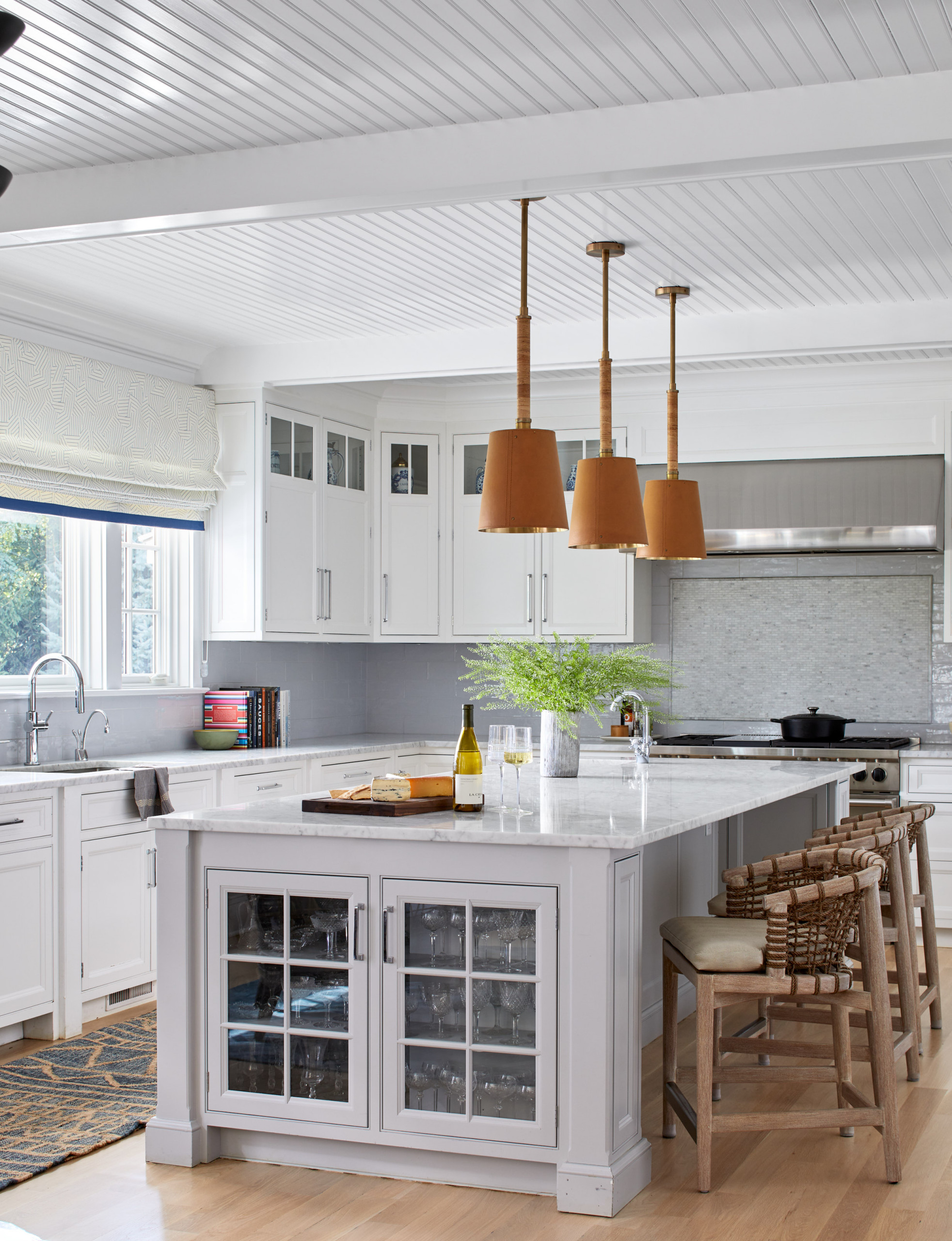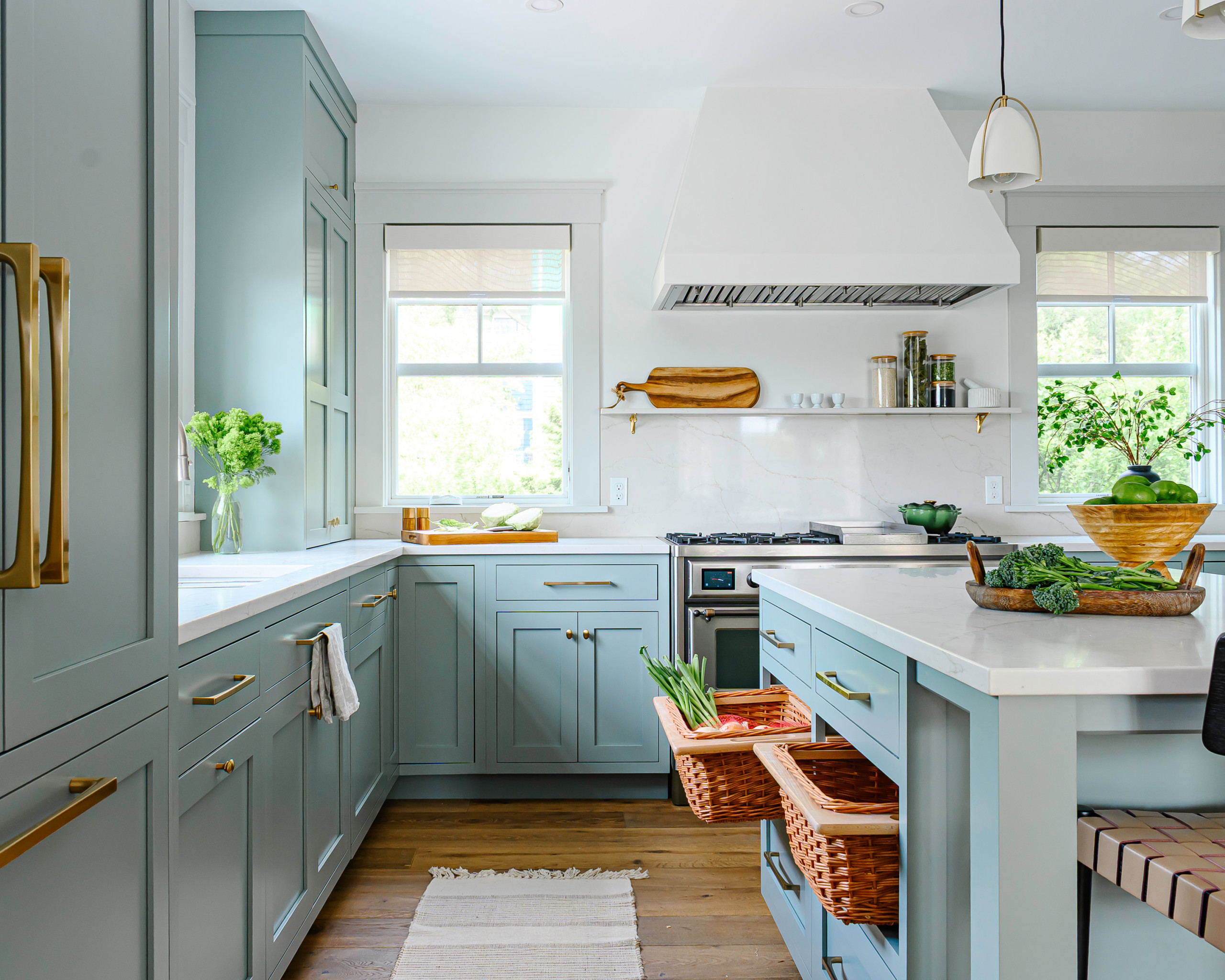 “Another benefit is that it allows you to include storage on the front of the island for items like serving ware, which can ease congestion in the working part of the kitchen when you’re entertaining,” Hauser says.