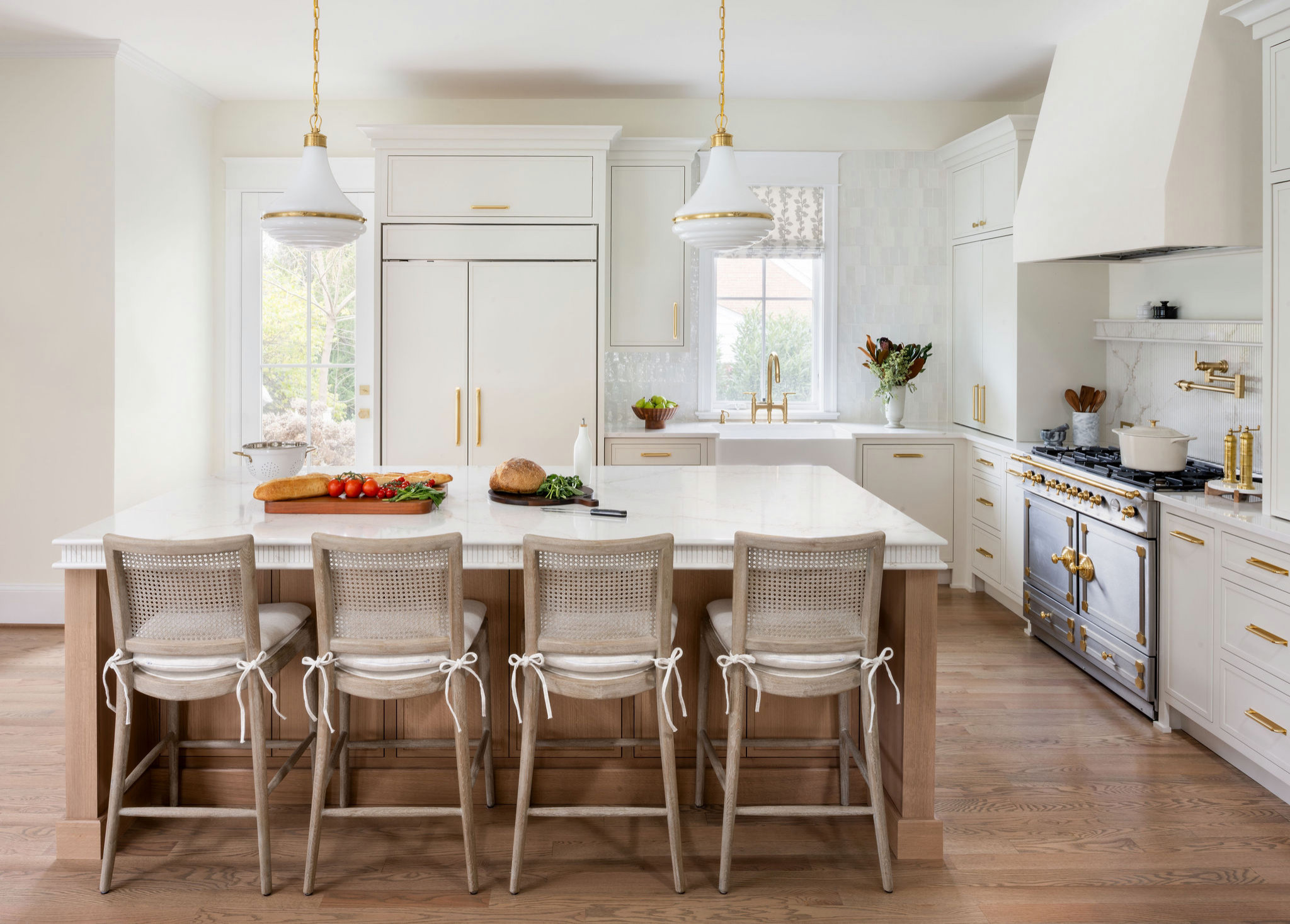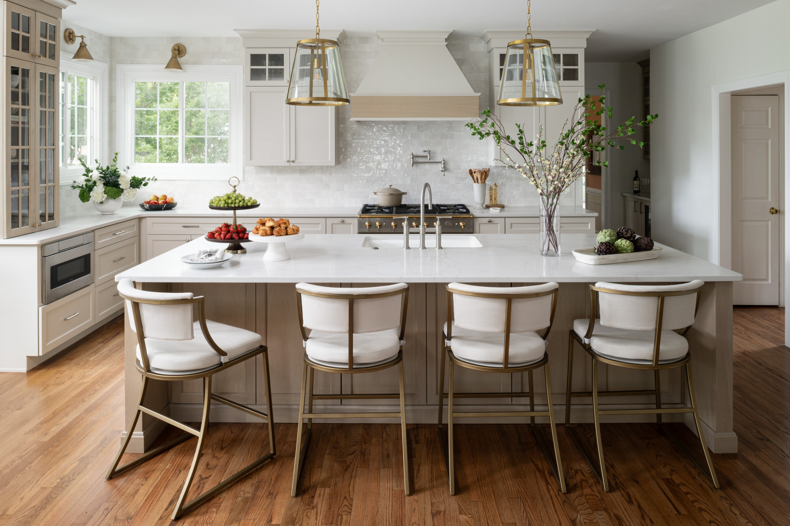 “The owner of this large kitchen in Saratoga, California, has a true love of cooking and entertaining,” she says. “Having two islands instead of one large island not only fit the design of the space but allowed the owner to designate one for meal preparation and cleanup and the other for serving and guest seating. As the chef of the house, they can float between the islands and the perimeter with the ease of a kitchen fairy.”