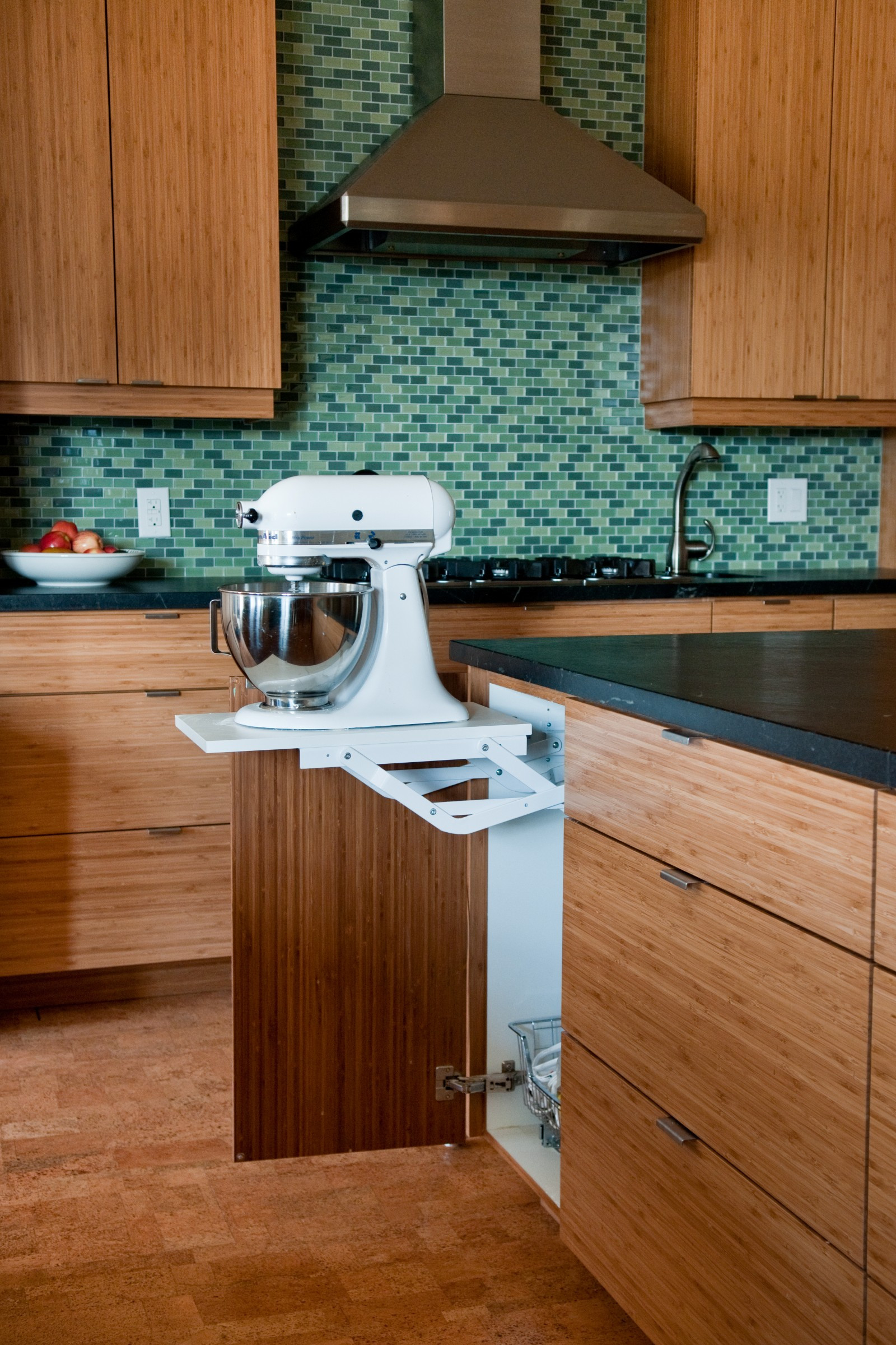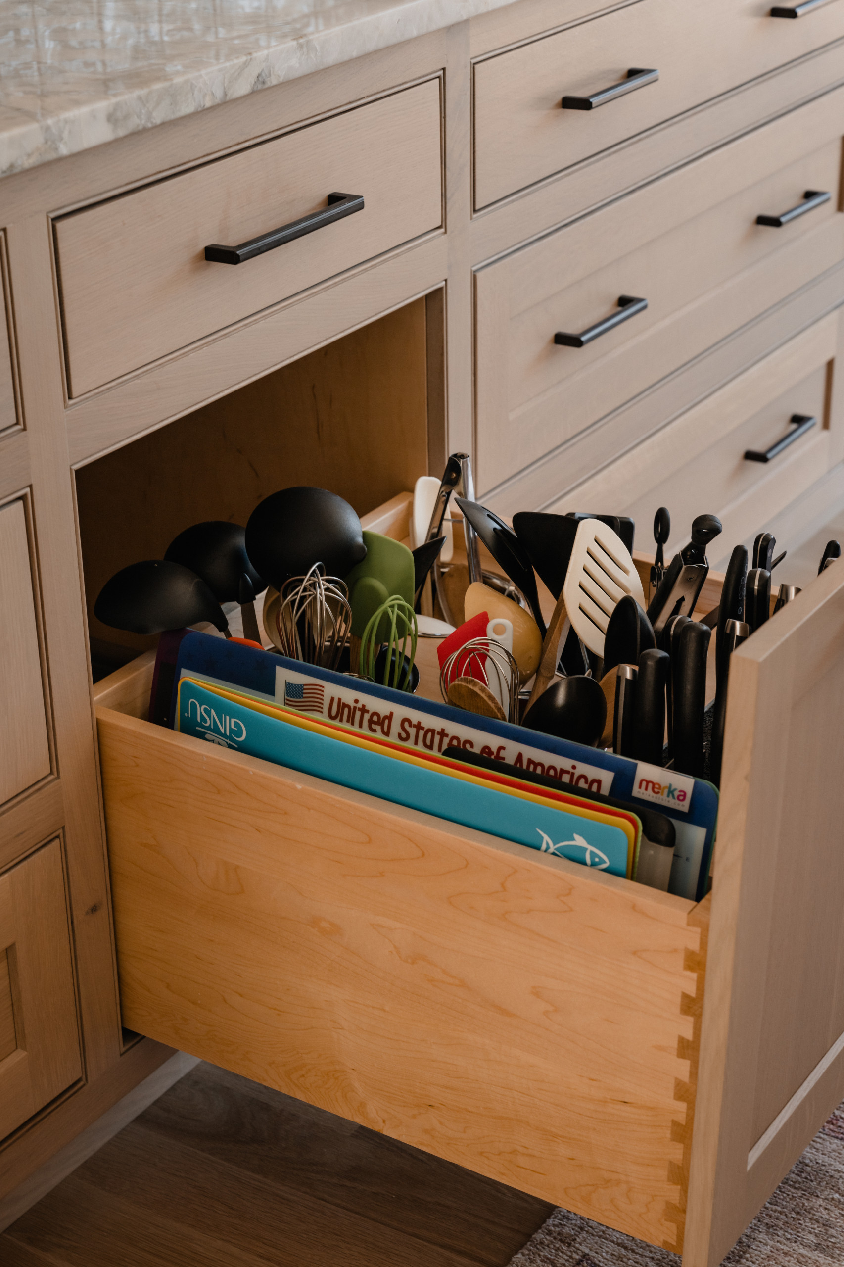 “I make use of the space at the bottom of the cabinet by adding a drawer to house the accessories and blades that come with the appliance,” Zobel says.