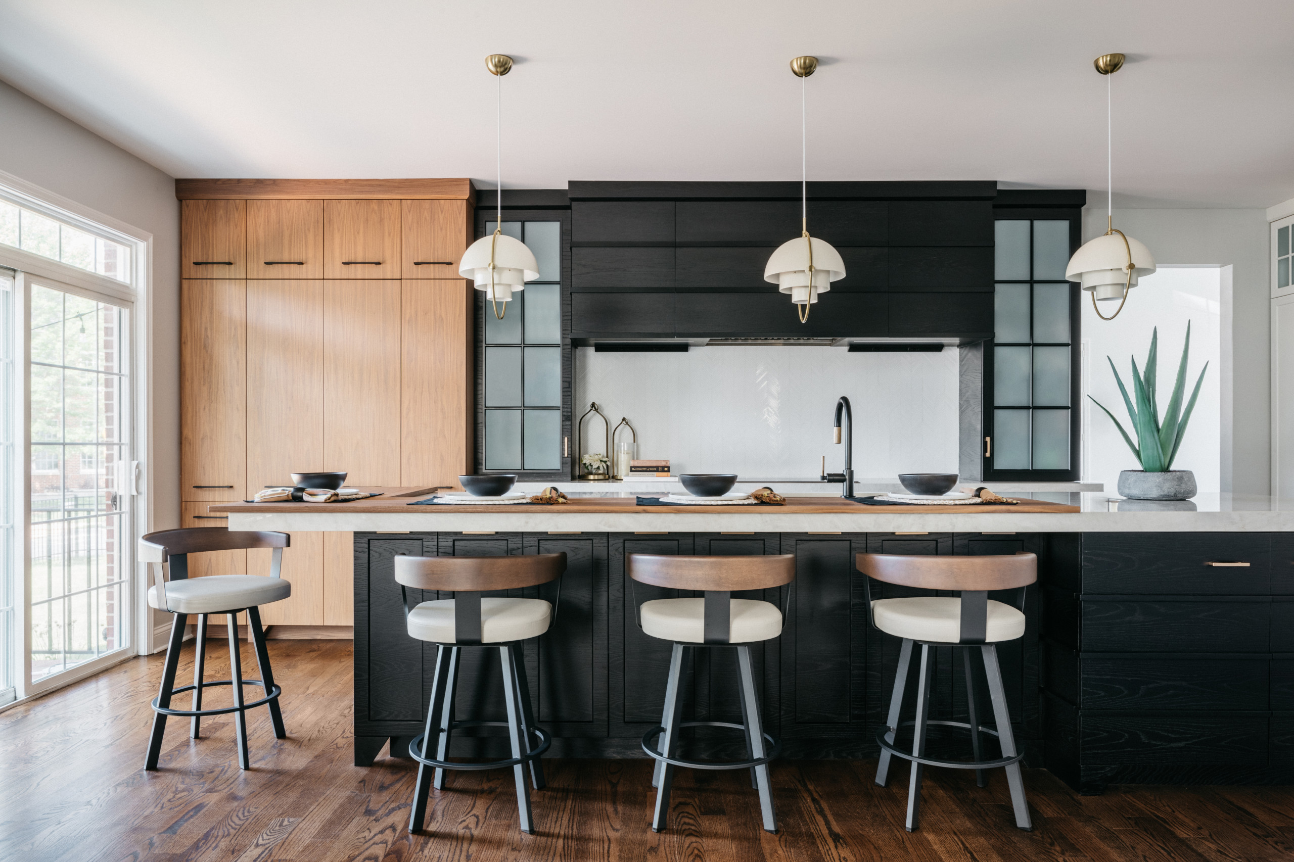 To define the dining portion of a kitchen island and give it “a restaurant dining vibe,” Hauser typically adds a slender section of wood above the stone countertop. This Chicago kitchen, where she applied a fine layer of walnut to the dining section of the porcelain countertop, is a great example.