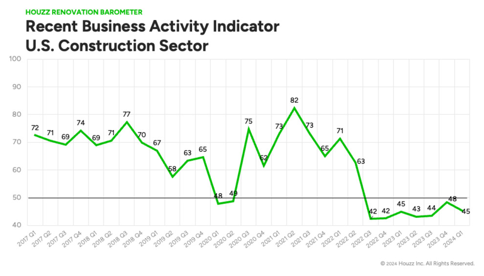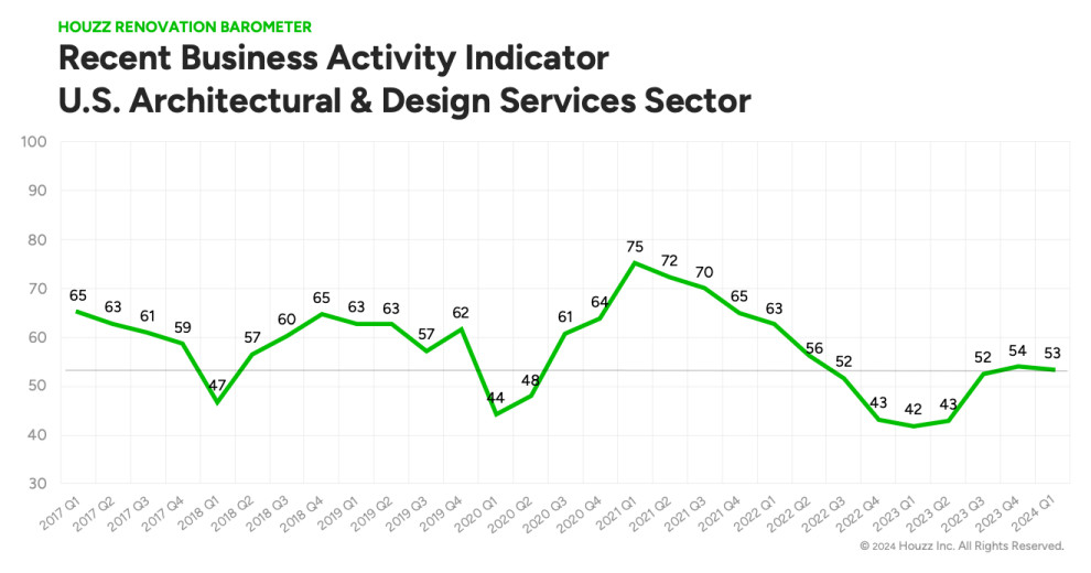 The Recent Business Activity Indicator was at 54 for architects and 52 for interior designers in Q1, which means more businesses in these groups experienced an improvement in activity than experienced a slowdown.
