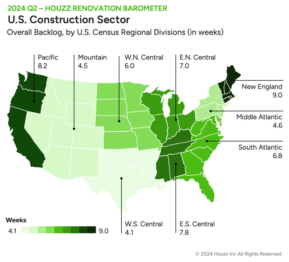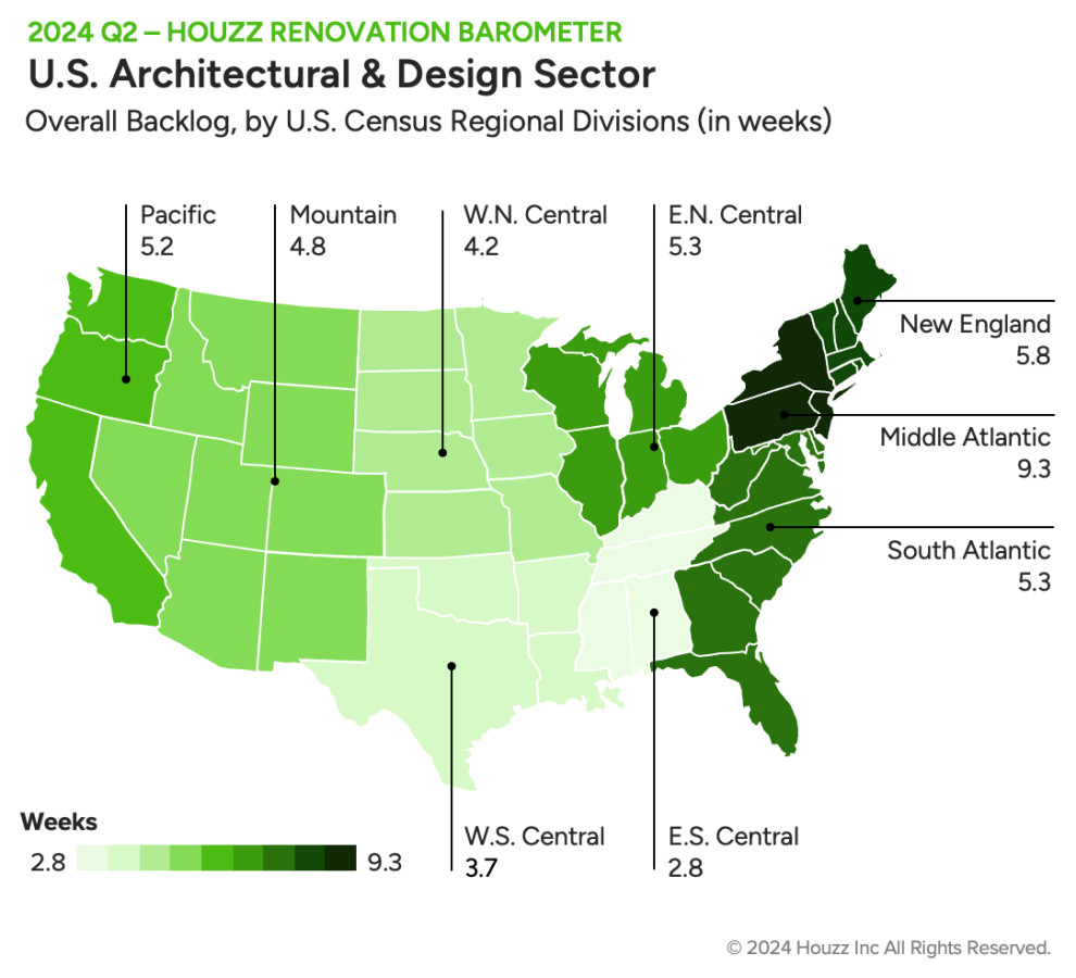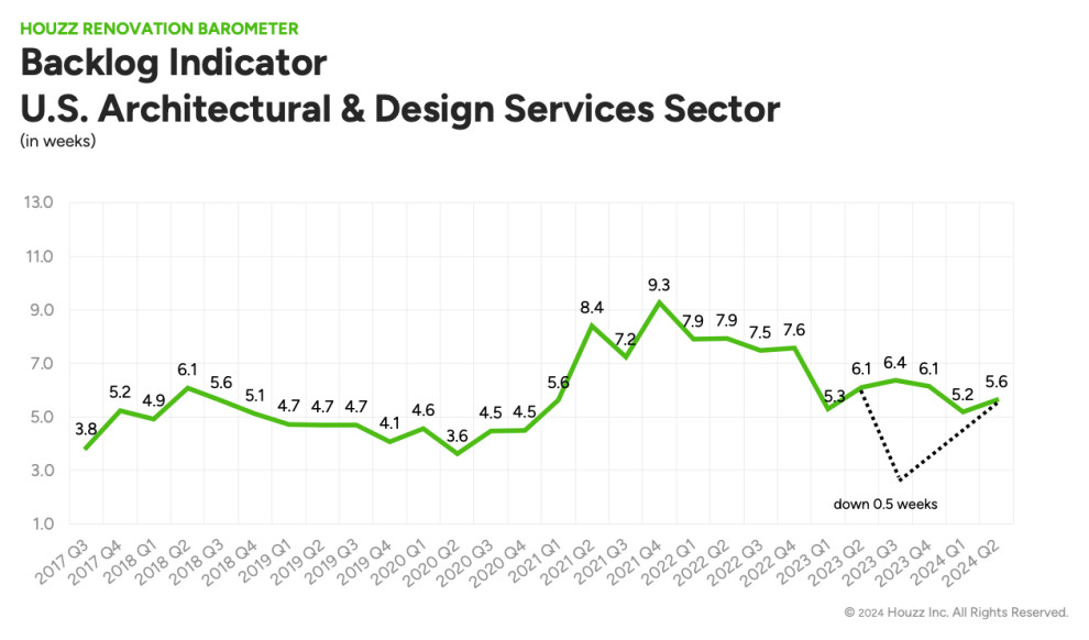 The year-over-year decrease is driven by architects, whose backlog is 6.2 weeks, down by 0.8 weeks from Q2 2023. Conversely, at 4.7 weeks, interior designers’ wait times are 0.1 weeks longer than they were a year ago.