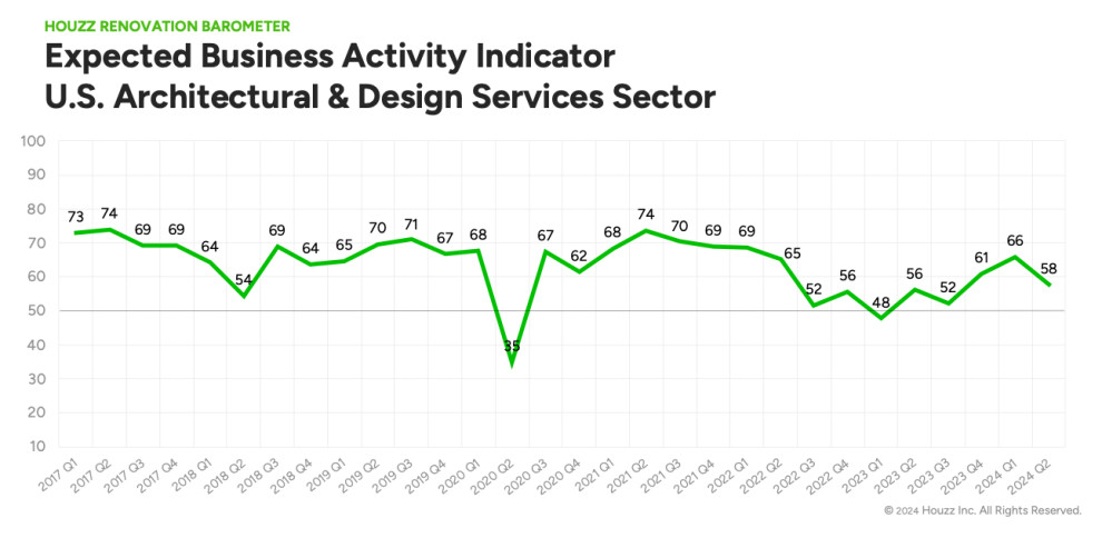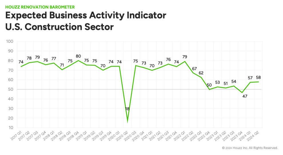 More construction and design firms expect growth than expect a decline, the Houzz Q2 2024 Renovation Barometer shows