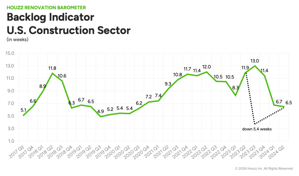 Those are key findings in the just-released Q2 2024 Houzz Renovation Barometer, which provides timely insights into the residential renovation industry, including expectations, project backlogs and recent activity among businesses in the construction sector and the architectural and design services sector.