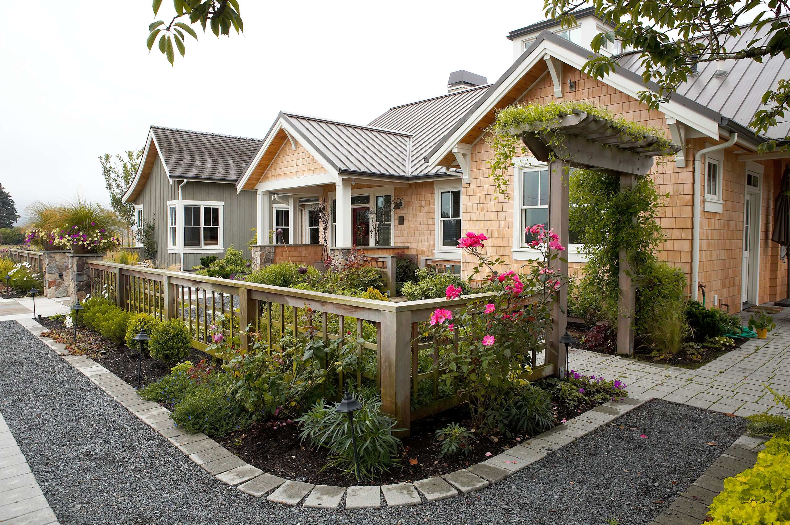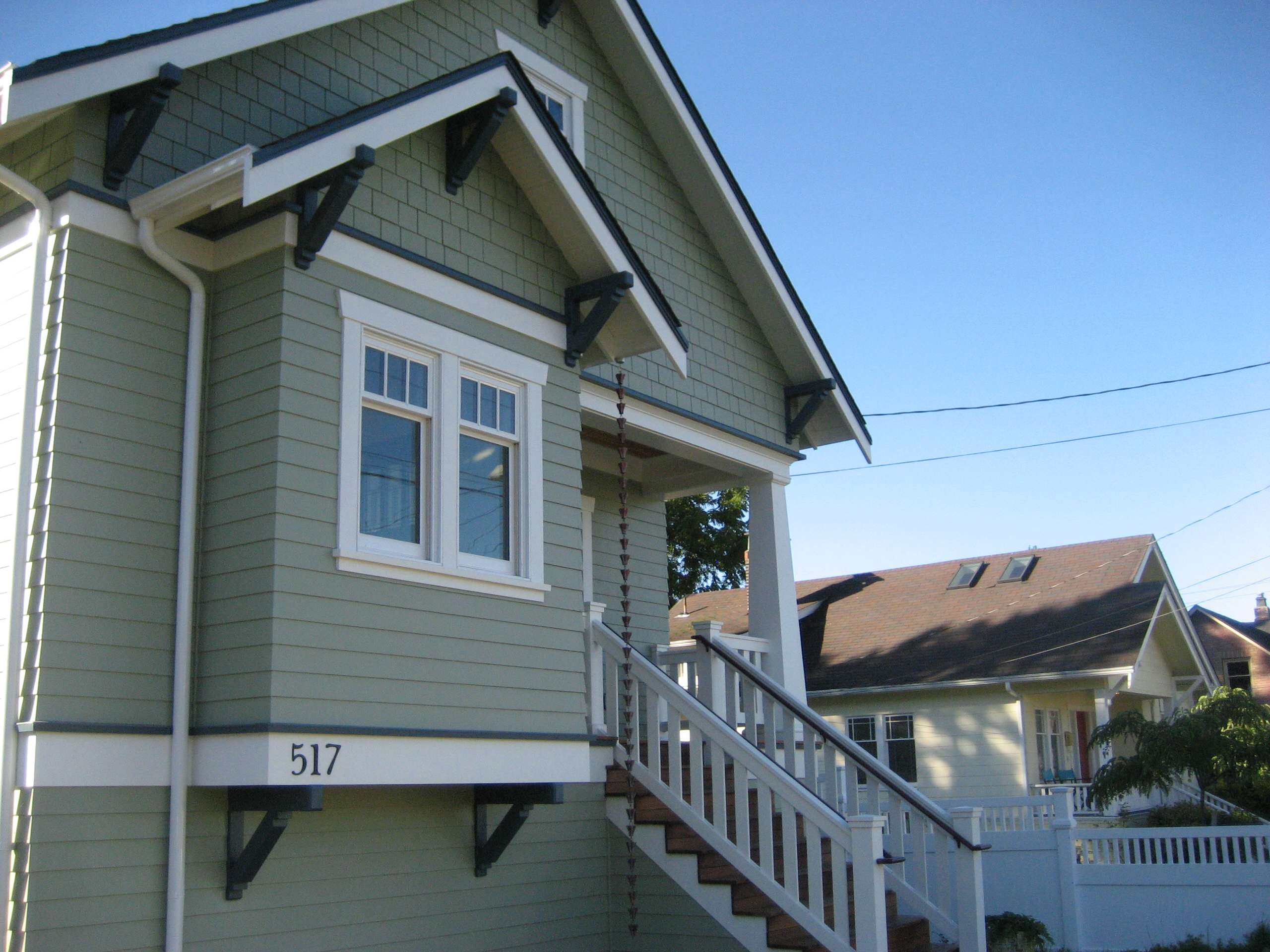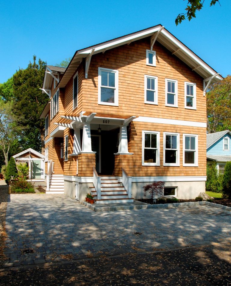 Exposed structural members and trimwork are painted here, while the shingles are left in their natural state.