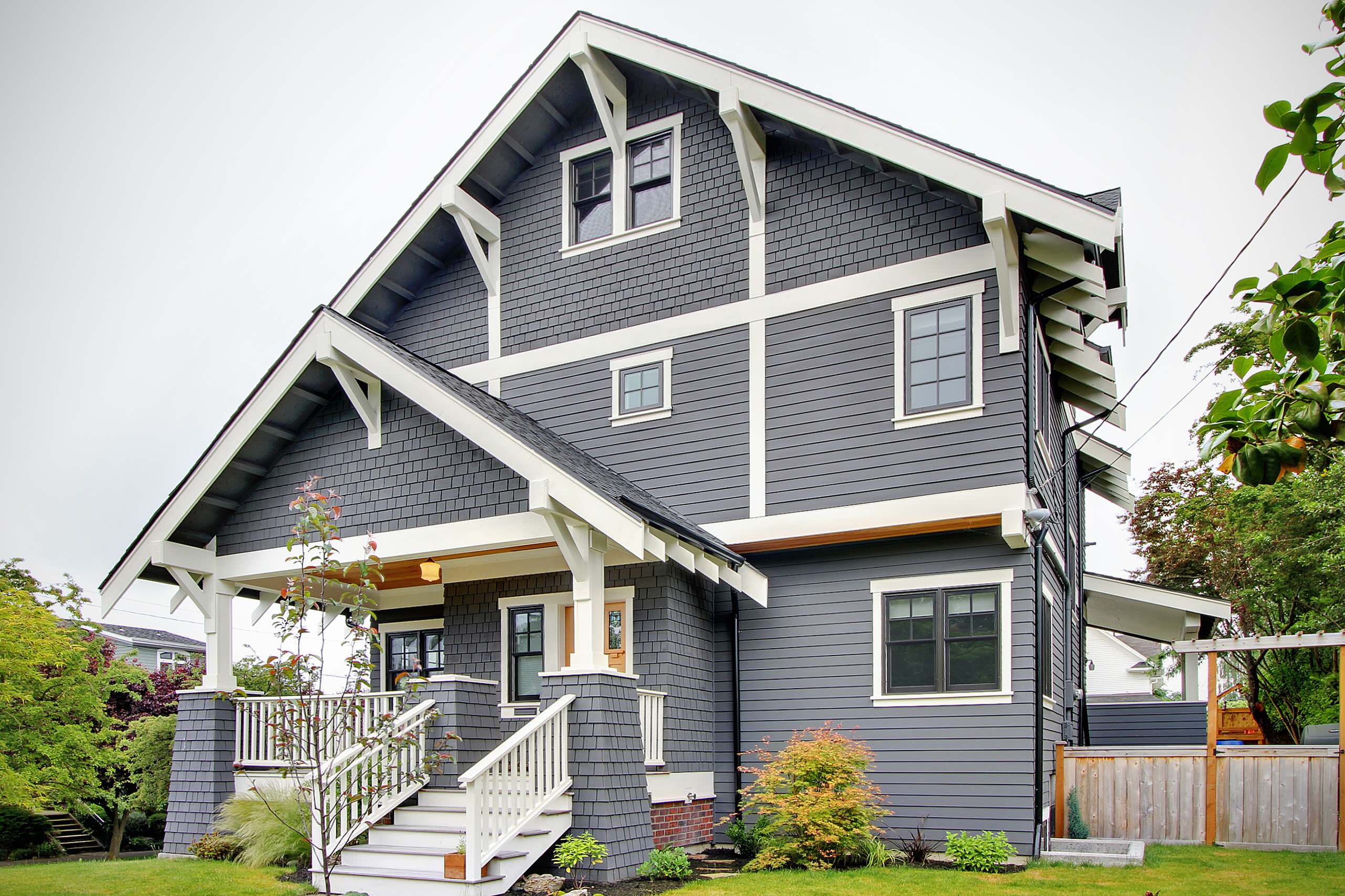 Painted in a contrasting charcoal color, the pedestals and knee braces pop against this home’s light gray exterior.