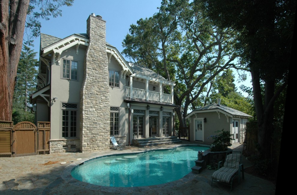 Both this pool house and the main residence feature clipped-gable roofs with embellished knee braces.