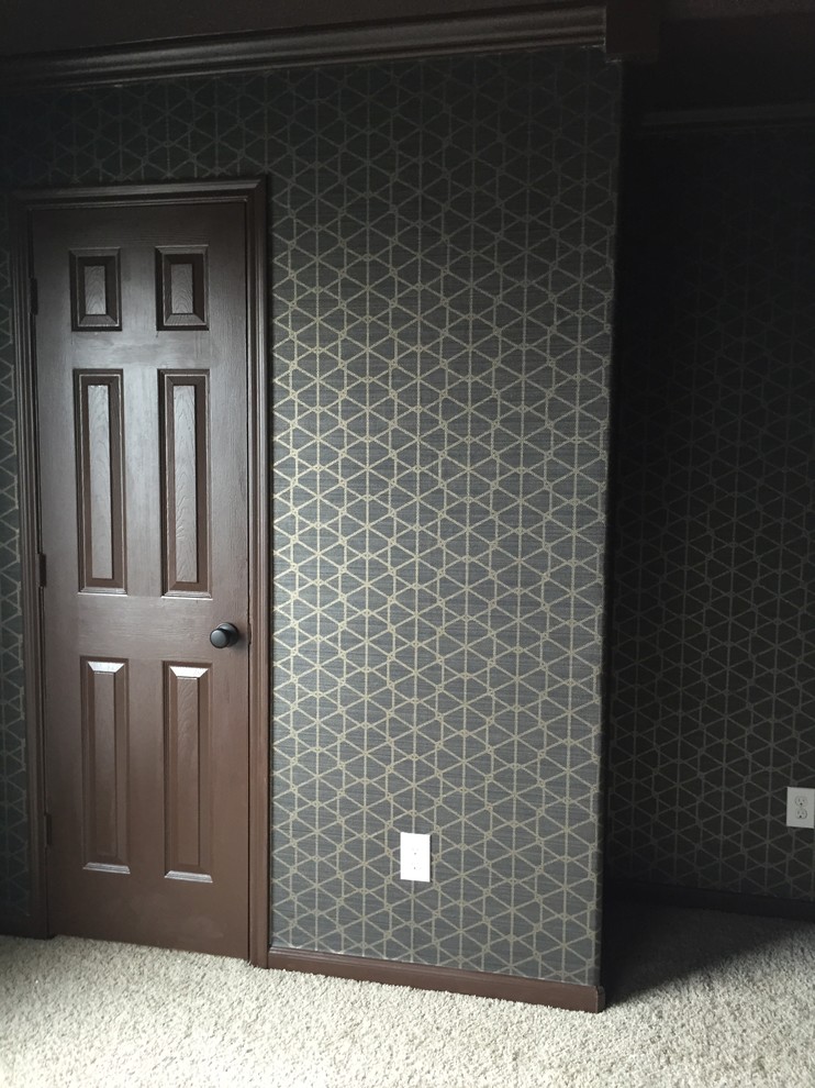 Patterns on fabric-backed vinyl tend to be simple, like the one on the wall of this theater room.
