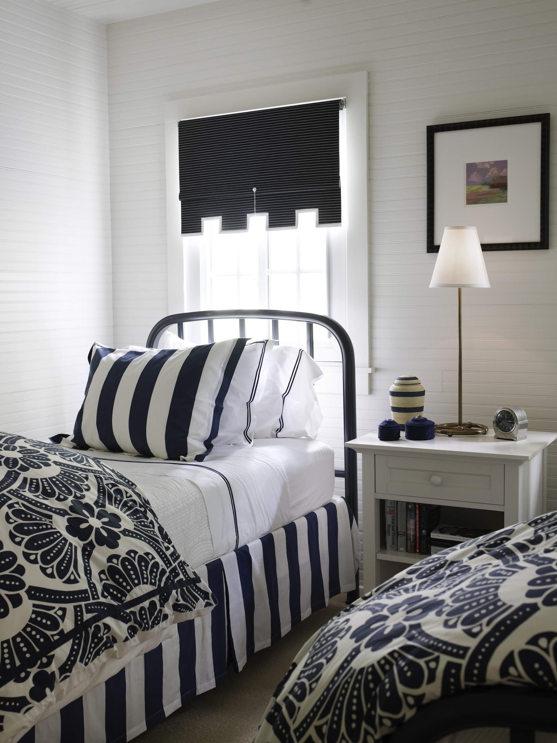 There are many reasons to use roller shades, and this room in Nantucket, Massachusetts, by Stedila Design, demonstrates one. There are many windows in this room with a steeply pitched ceiling. Good news, as most people enjoy a light-filled space. But the wealth of windows leaves little room for artwork. The designers solved the problem by choosing shades crafted in the style of a vintage transit schedule. When they are pulled, they obviously block the light and enable sleep, but their graphic typography also adds energy and fires up the imagination.