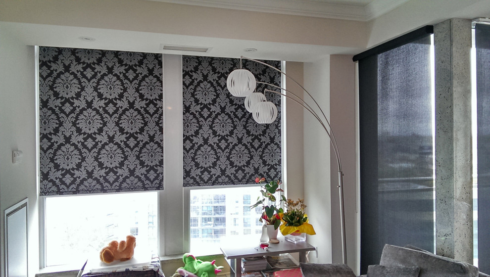The fancy damask pattern on these roller shades, by ResCom Designs, shows how a traditional pattern can make the modern window treatment fit many environments.