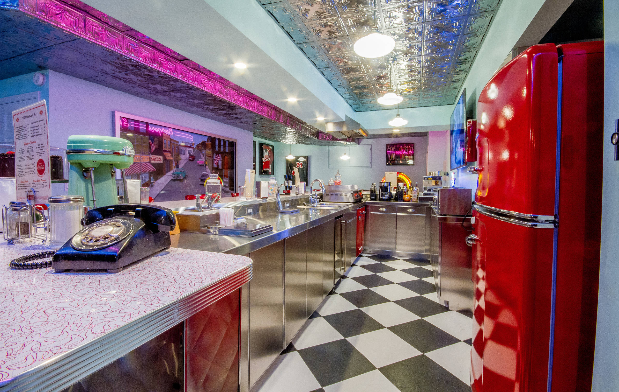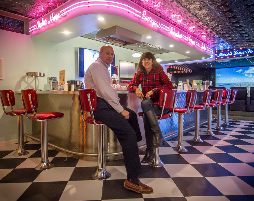 Tedd and Debra March take a seat at the counter in their 1950s diner.