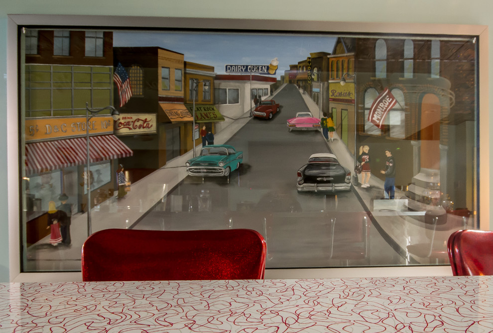 This photo shows the mural that the couple commissioned, which is intended to look like a window onto the town outside the diner. The buildings in it are a mix of those found in Monroe, where the couple live now, and Flat Rock, Michigan, where they both grew up. Debra gave the muralist her old cheerleading sweater as a model for the outfit that the blonde woman wears in the scene. The artist is LeAnn Harbaum.