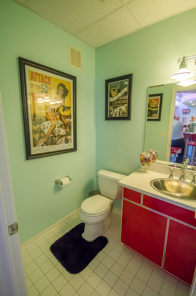 Just off the diner, the Marches updated their bathroom to match the diner decor by adding the new vanity cabinet.