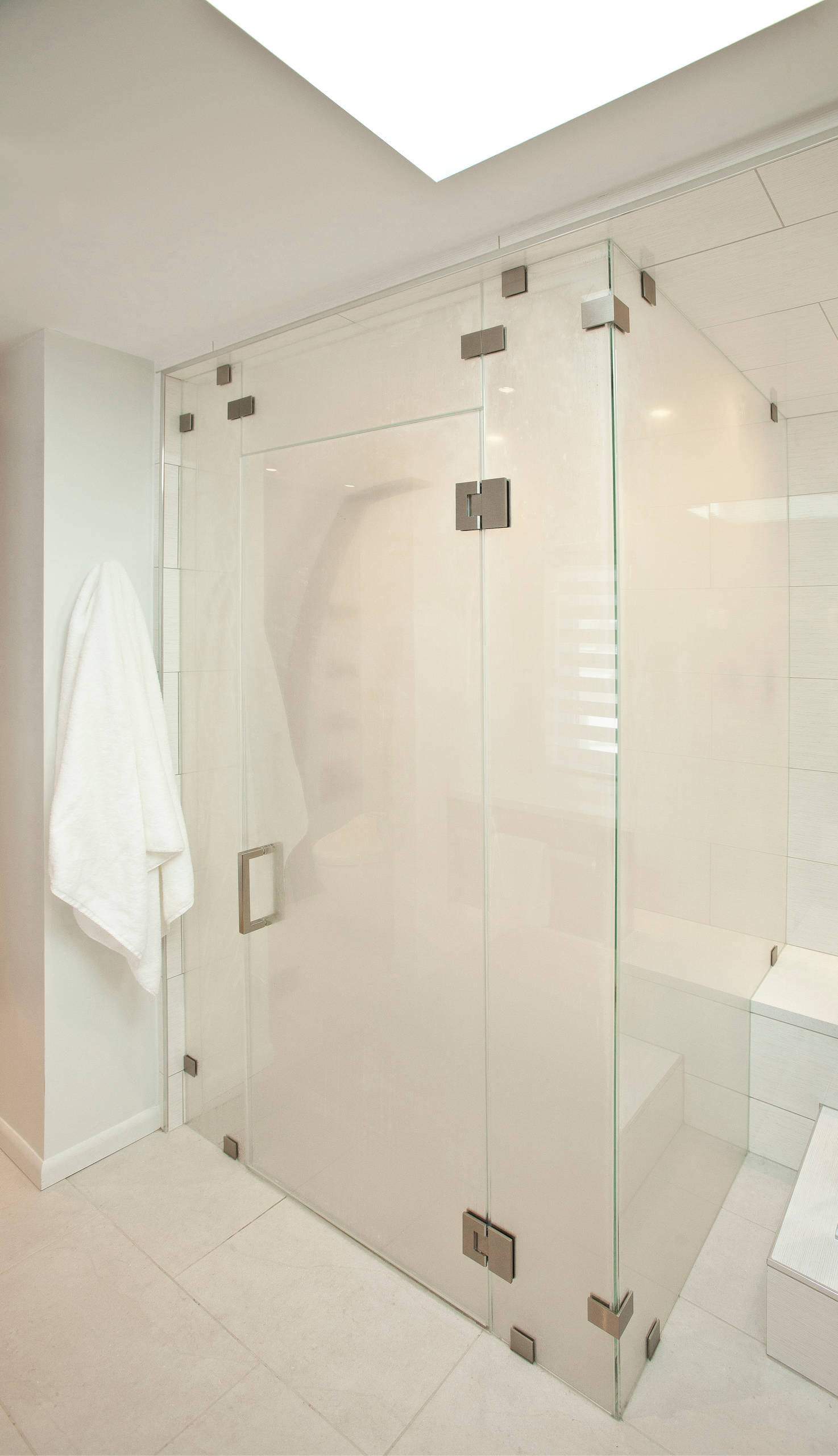 A bench continues from behind the tub into the steam shower, connecting the elements along this wall. It is tiled in 12-inch by 35-inch porcelain tiles and capped in quartz.