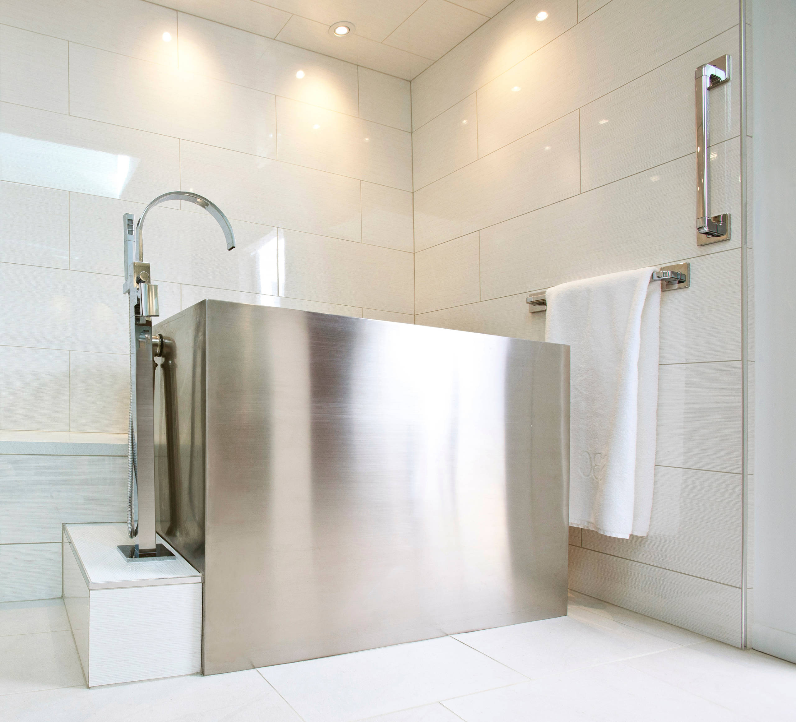 “The homeowners are modernists and wanted a much more minimalist look in here,” Duebber says. Part of this look is the Ufuro bathtub they chose. The brushed stainless steel has a sterile look these two doctors appreciate. The filler and faucets are in brushed chrome that coordinates well with the tub’s finish.