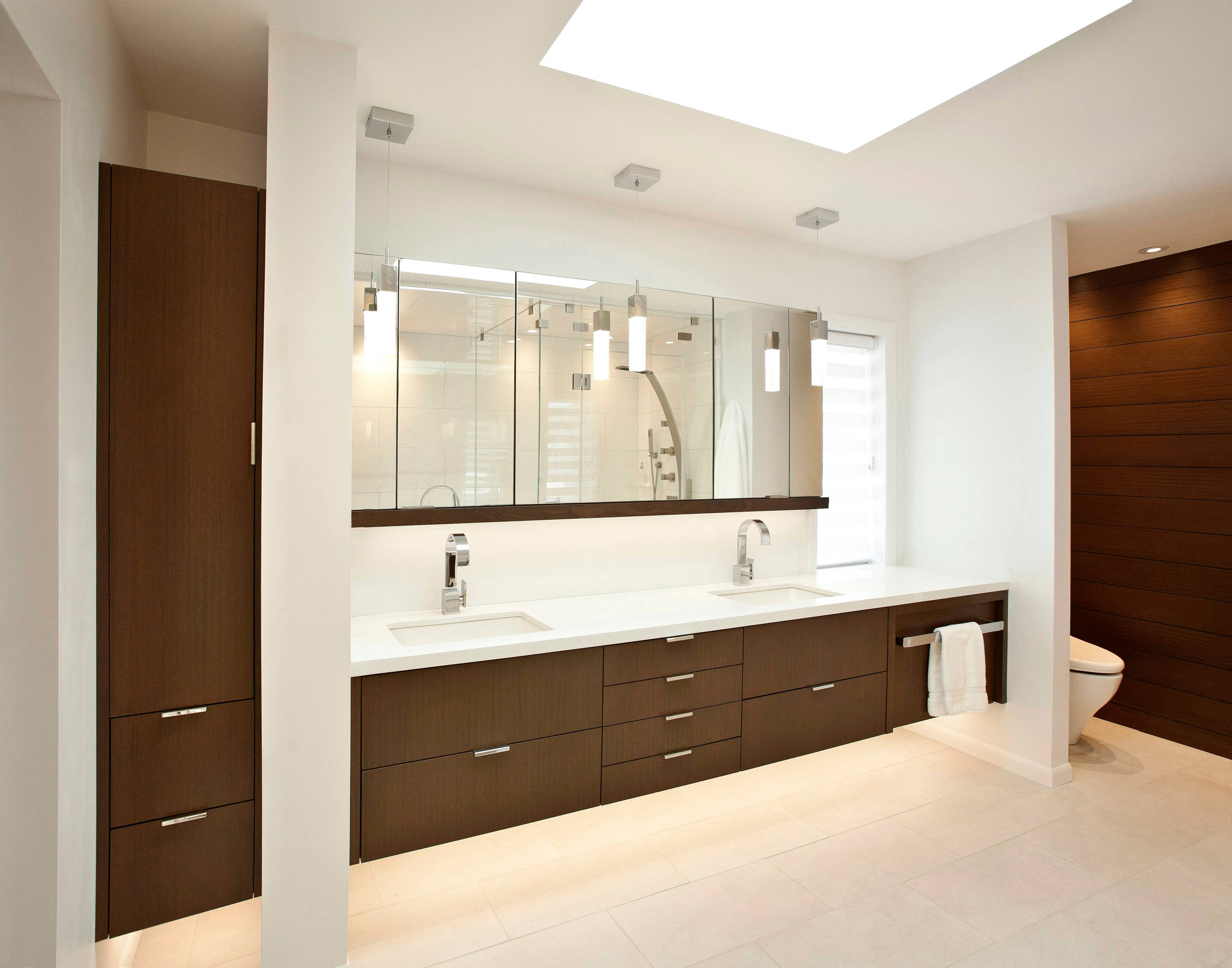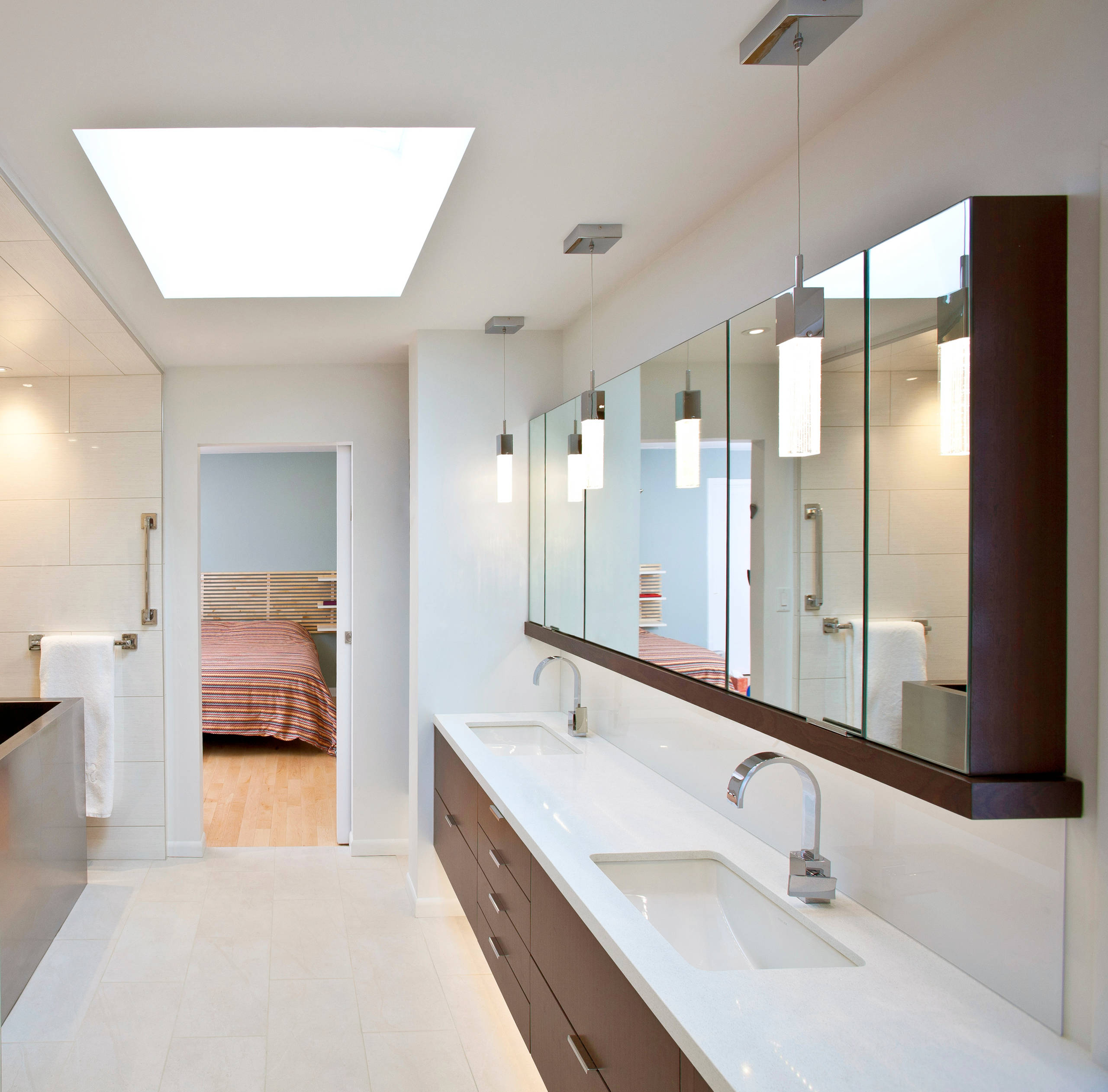 A separate toilet room can be a great thing, but not so much when your knees are hitting awkward bifold doors in a claustrophobic space. That was the case in this master bathroom, which was dark, dated and awkwardly laid out to boot. The style of the home is modern, and the homeowners were more than ready to update the bath and embrace a more minimalist style. Architect Ryan Duebber borrowed a section from the bedroom just 16 inches deep to open up the room, created strong contrast between white finishes and rich sapele wood, and flooded the room with light via a new skylight. The result is a beautifully crisp and bright, slightly larger room that feels twice the size of its former self.