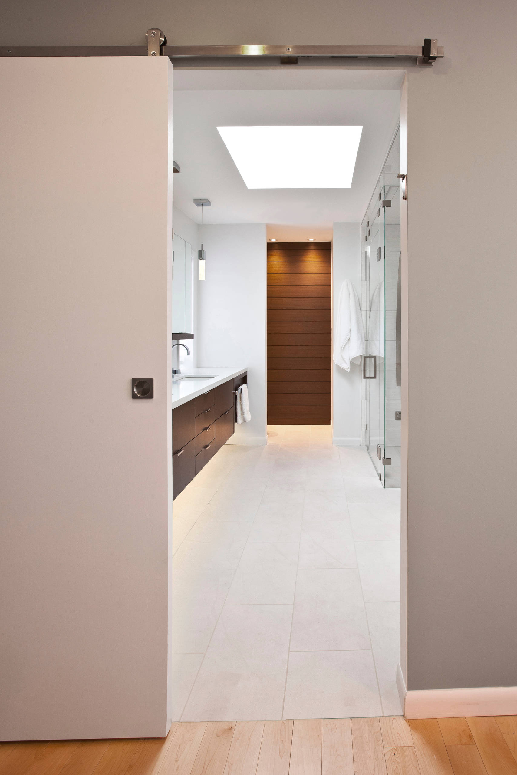 A new track door separates the bathroom from the master bedroom. This keeps a swinging door from hogging space when open. The track and hardware relate to the other steel pieces in the new bathroom.