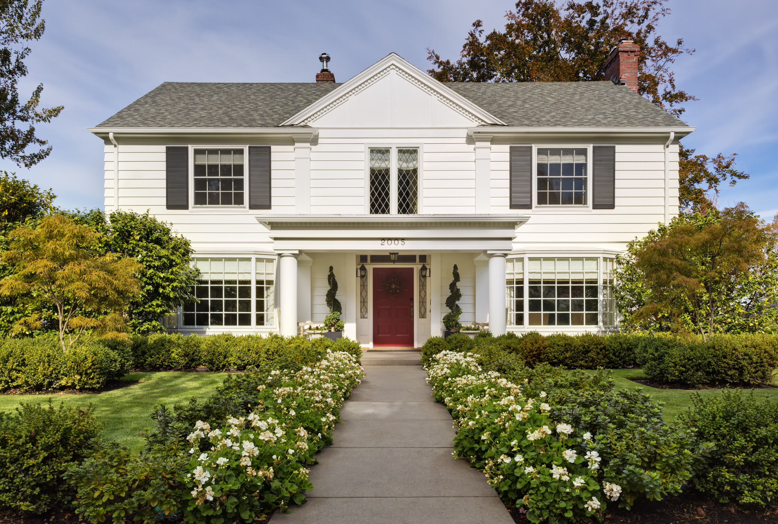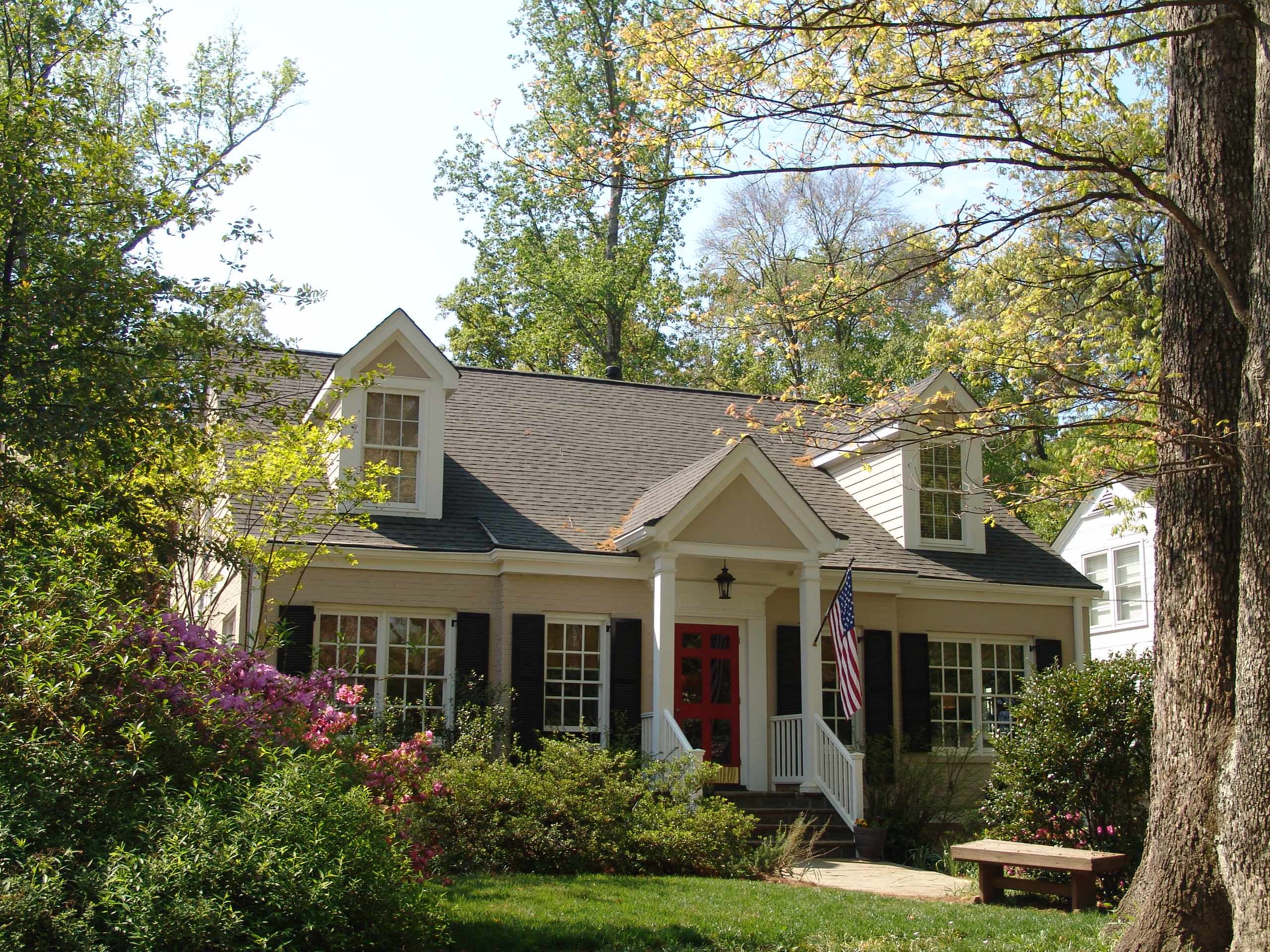 Notice how this house closely resembles a Cape Cod colonial. However, upon closer inspection, you'll see there are only two dormers instead of three, there are two grouped double-hung windows on the outer front elevation, and there are two windows set in a projection of the elevation. It has a classically detailed entrance surround and a tiny porch. The color scheme, with a red entrance door, is a favorite in this style.