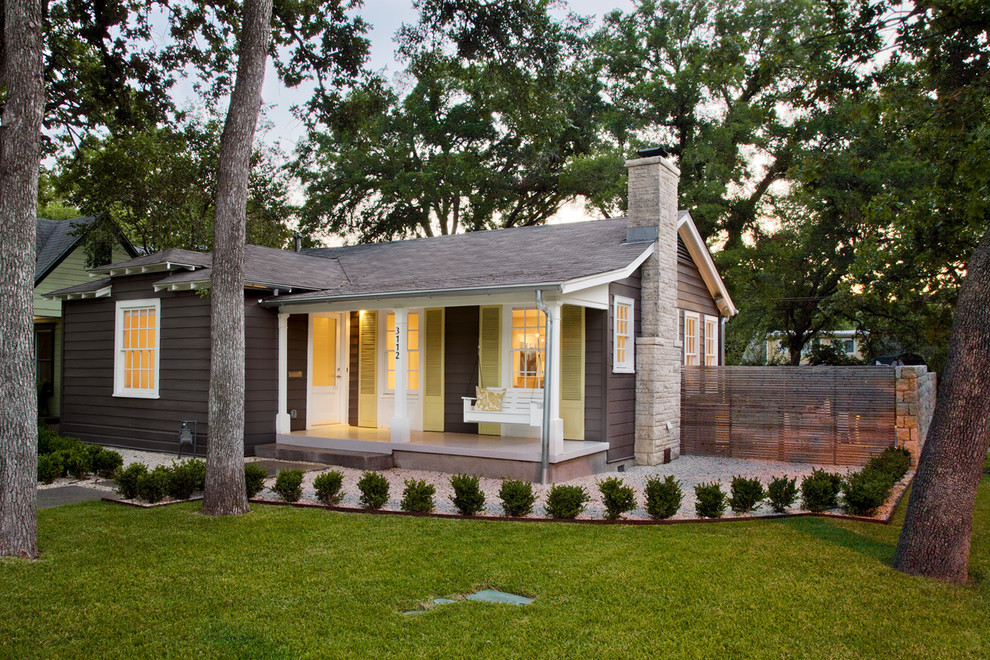 Since minimalist traditionals are common in most regions, the types of materials to clad them vary widely. Clapboard, board and batten, stone and brick veneer all occur in this style in numerous variations. The common thread, however, is that the indigenous practices of local tradespeople usually determines the choice. Clapboard siding is a common material in the area where this house is, and limestone veneer is a common local finish in Central Texas, where the next house is. The last house, in Atlanta, has brick veneer, a common exterior cladding in that area.