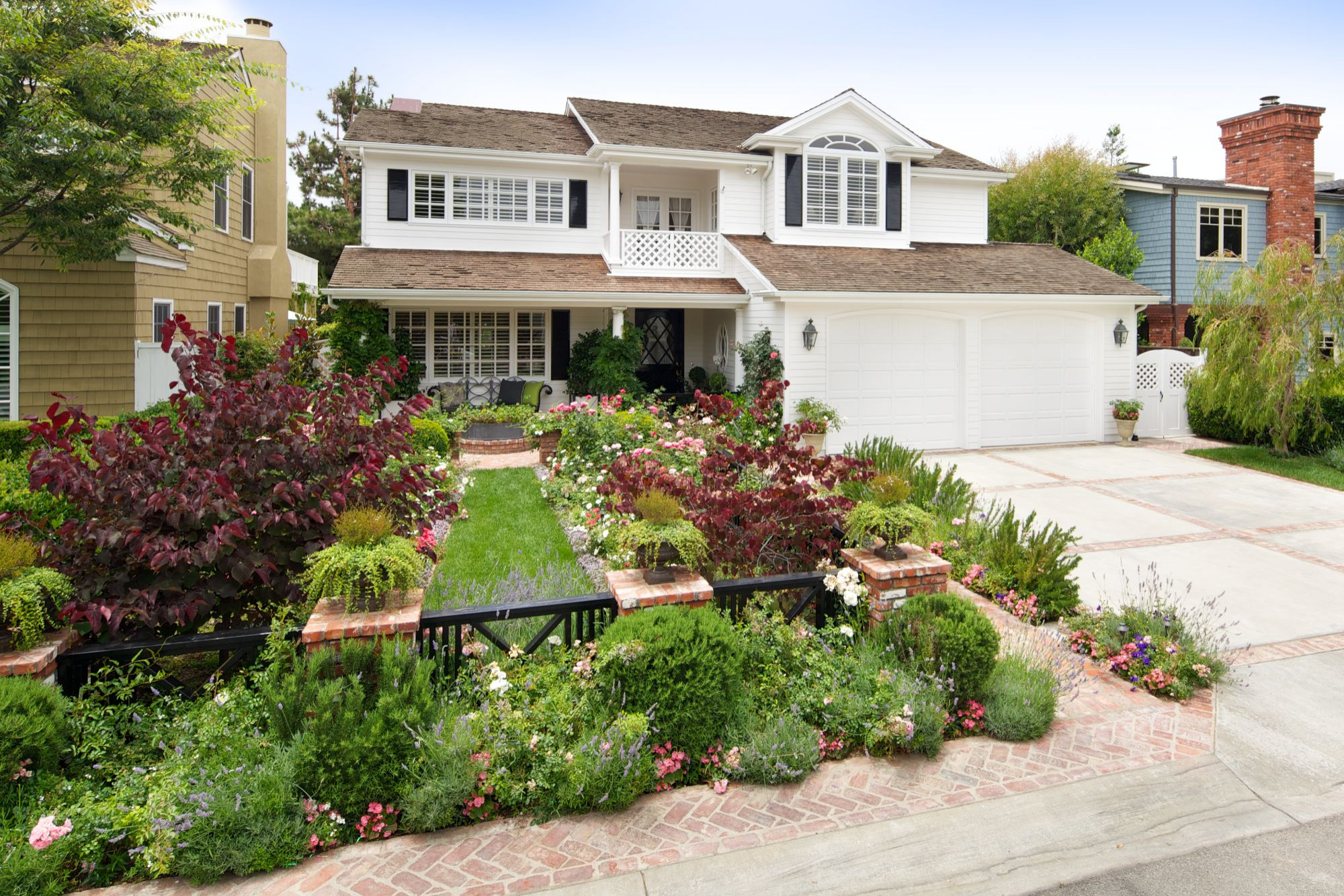 Notice the gable- and shed-roof forms on this California house. Typically side gabled, as on most minimalist traditional homes, the roof forms fall to the lower level, wrapping over the garage and around the second floor. The roof pitch is modest, and an accent of a forward-facing second-floor window gains attention with its own gable-roof form.