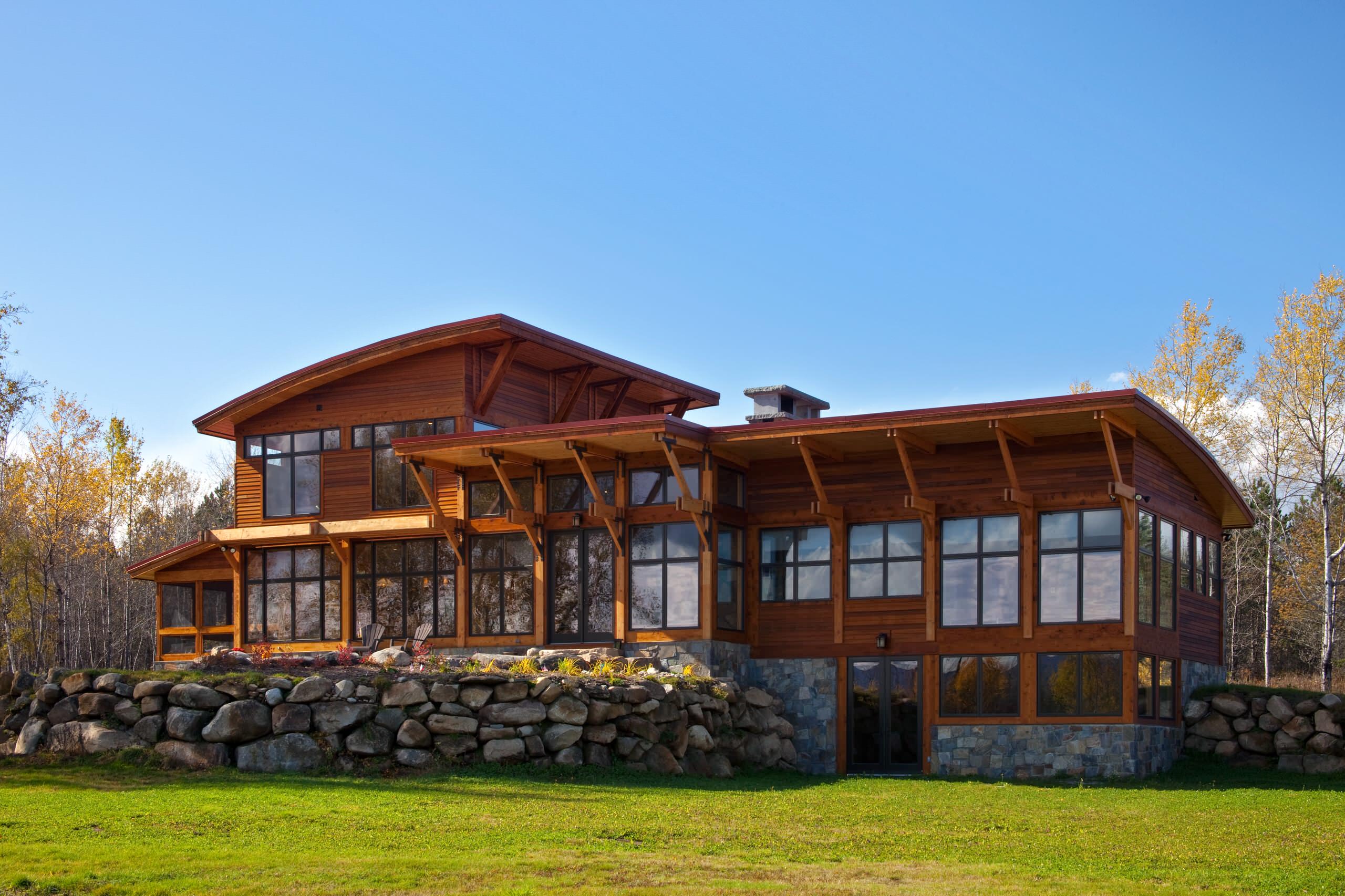 In the New York lake house by Phinney Design Group, below, a fascinating blend of contemporary and rustic styles is completed with a segmental vault roofline. Naturally stained wood siding and structural timbers are clearly and boldly expressed in the design theme in International fashion. The curve of the roof softens the prominent rectilinear lines.