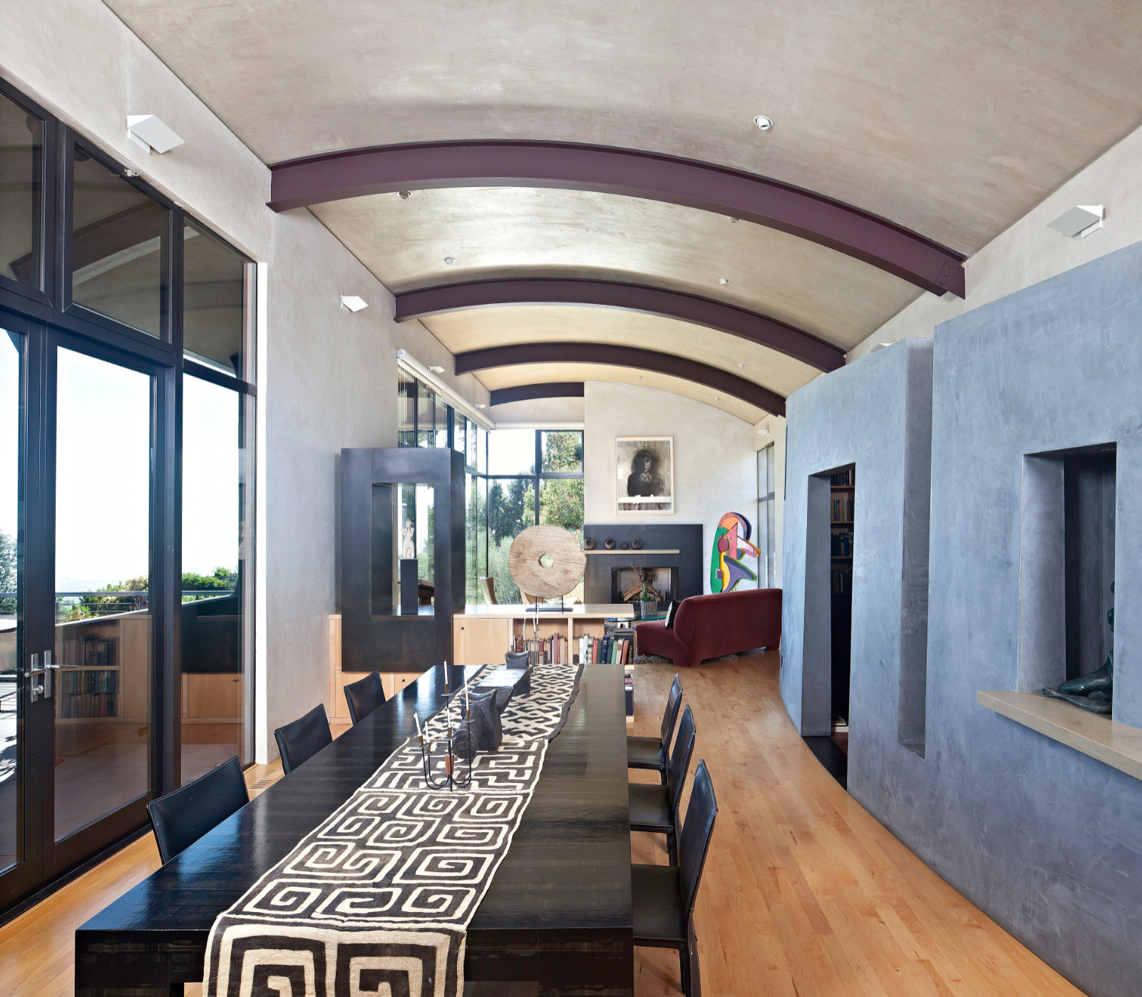 This Bay Area house employs curved steel I-beams to create the structure. I-beams are well known for use in commercial buildings but are rare in residential structures. The advantage of steel is that you can usually get much wider spans in smaller beam dimensions than with wood timbers.