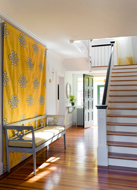 The floor-to-ceiling rug in this Rhode Island home, by Andrew Suvalsky Designs, adds color and impact in the entry.