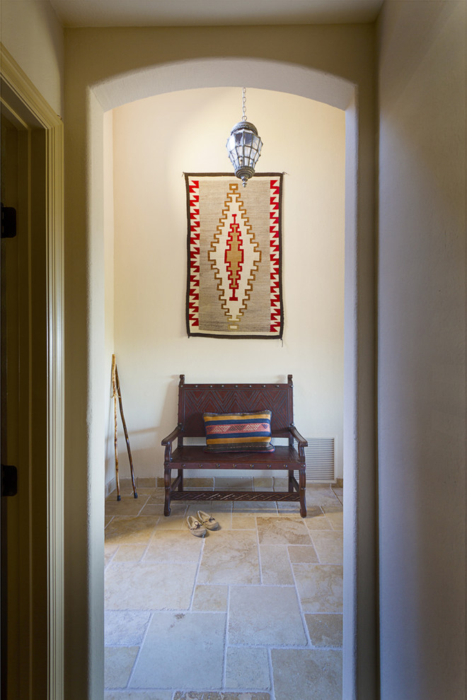 Rugs need not be large or highly decorated to make a statement. This small rug with a graphic pattern adds the perfect grace note over a rustic bench in a home by Prideaux Design.