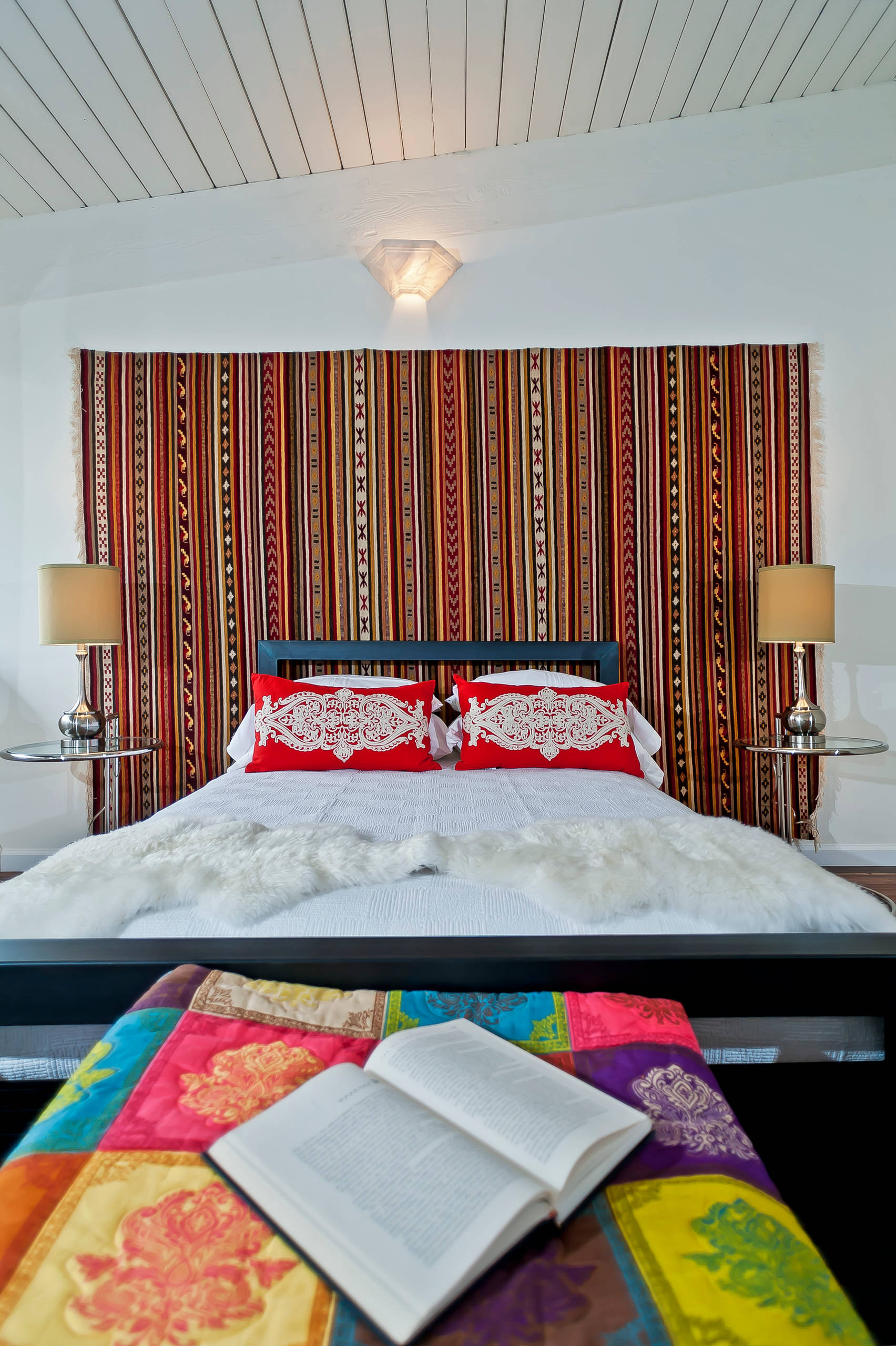 In this home Modern Mecca made a simple headboard so much more by placing a bold rug behind it.